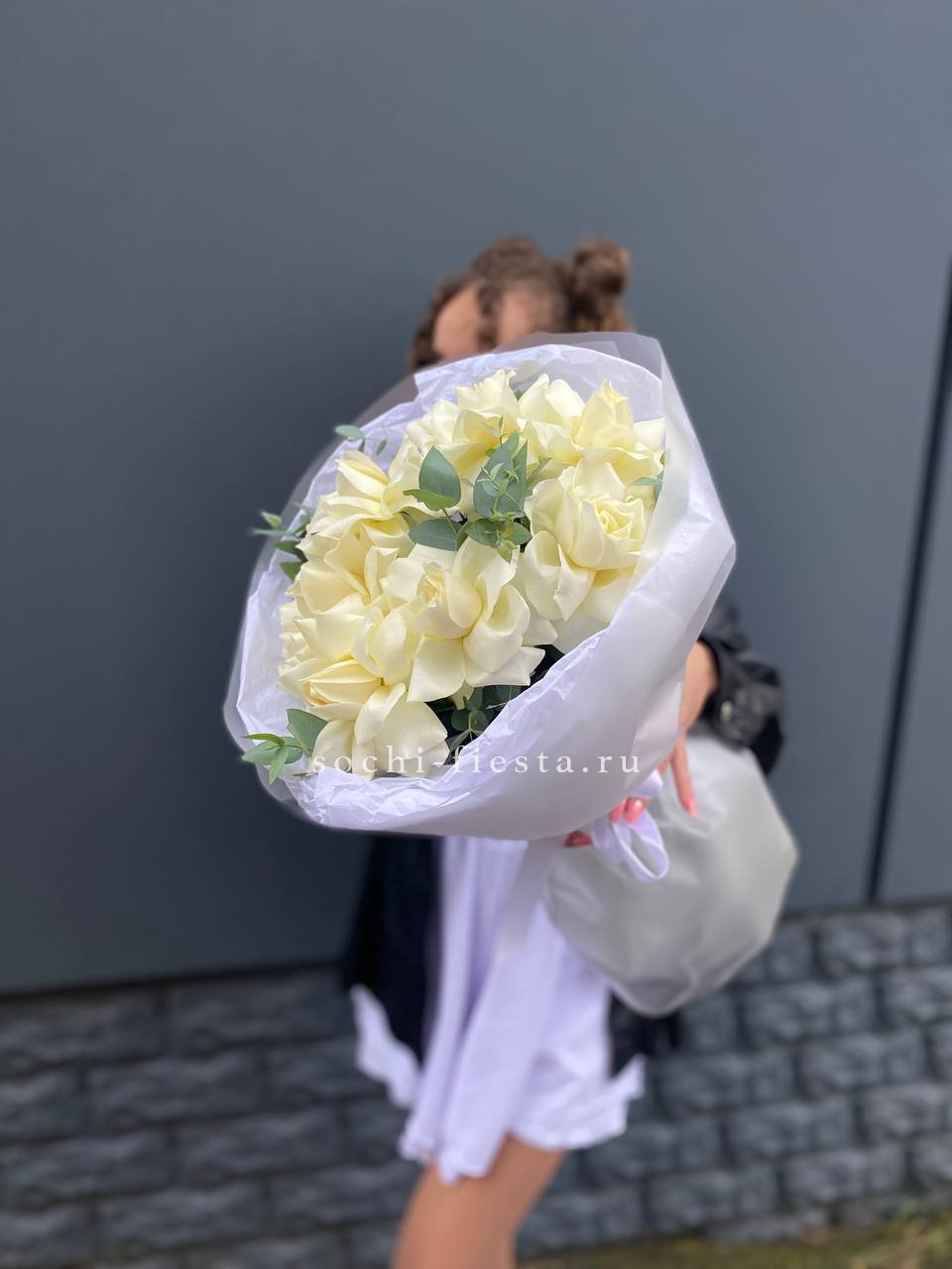 Тридцать пять белых бутонов образуют плотный монохромный ансамбль. Классическая форма и чистота оттенка позволяют букету звучать самодостаточно в любом интерьере.