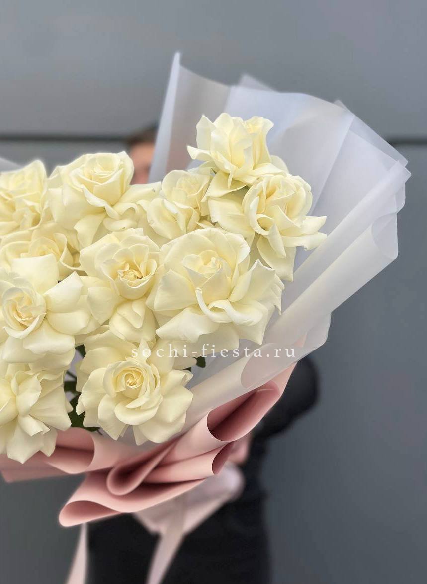 Пятнадцать вывернутых роз White Dream раскрываются широкими головками с волнистыми лепестками. Белый цвет переливается от молочного до холодного снежного оттенка.