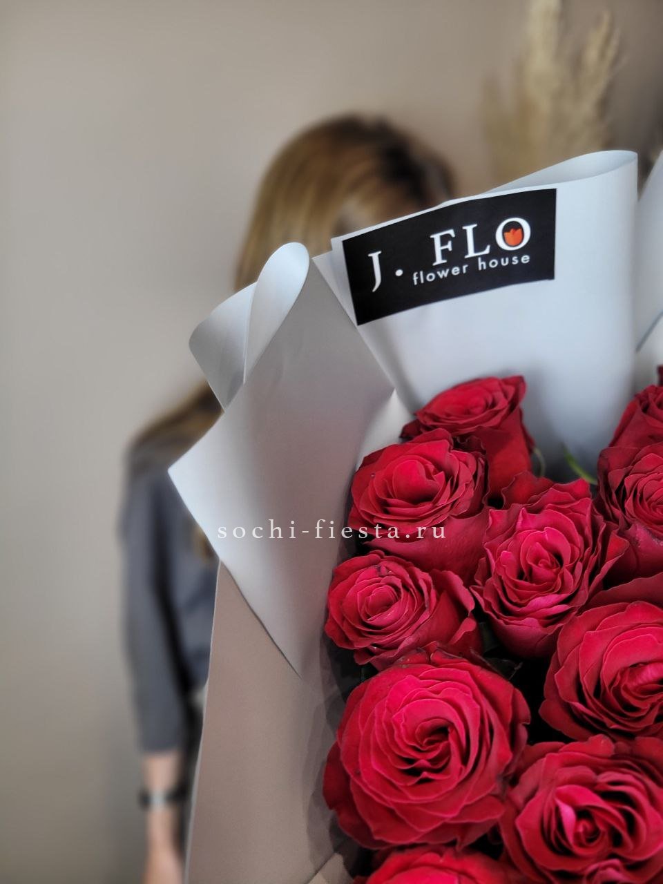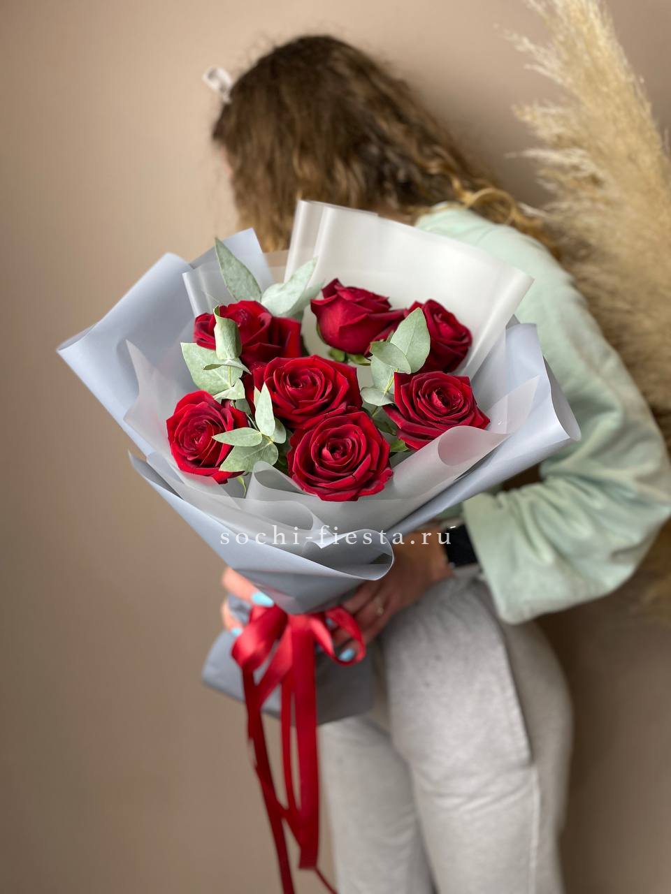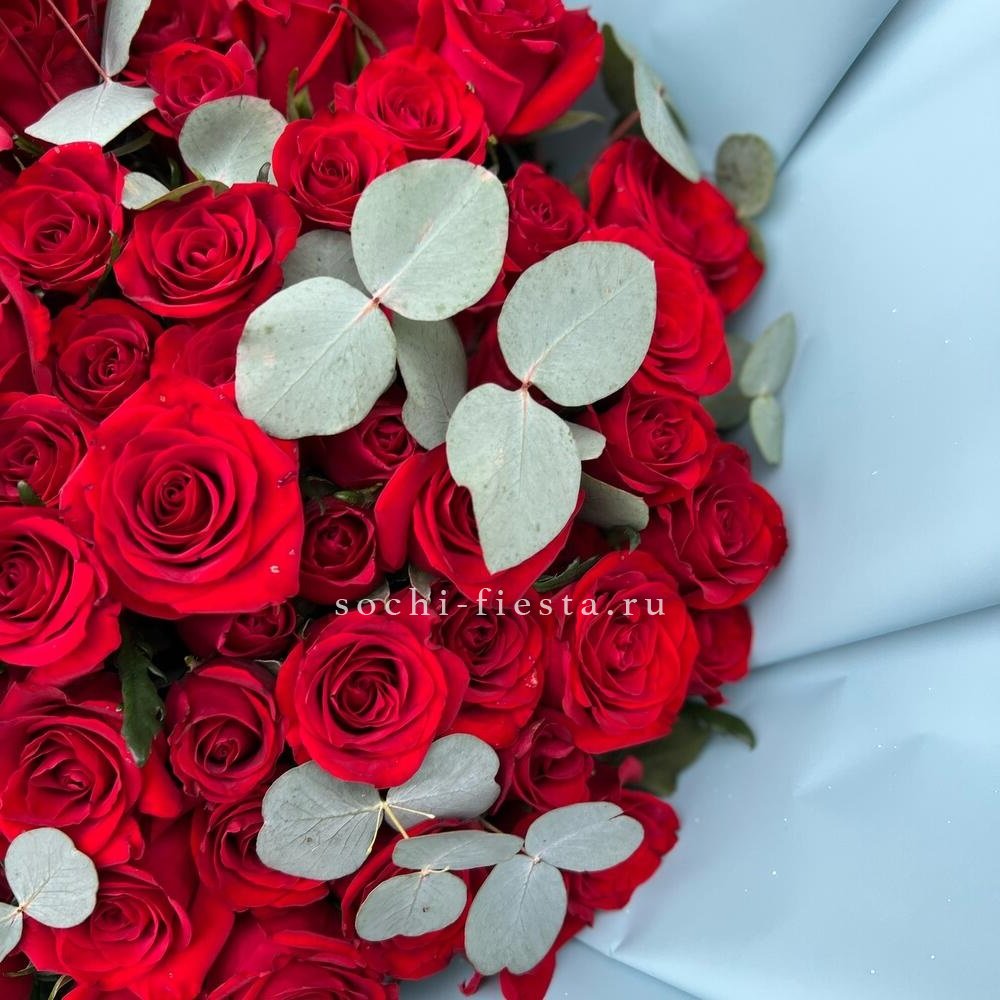 Сто один красный бутон дополнен ветками эвкалипта с серебристой листвой. Объёмная композиция занимает пространство и притягивает внимание своей масштабностью.