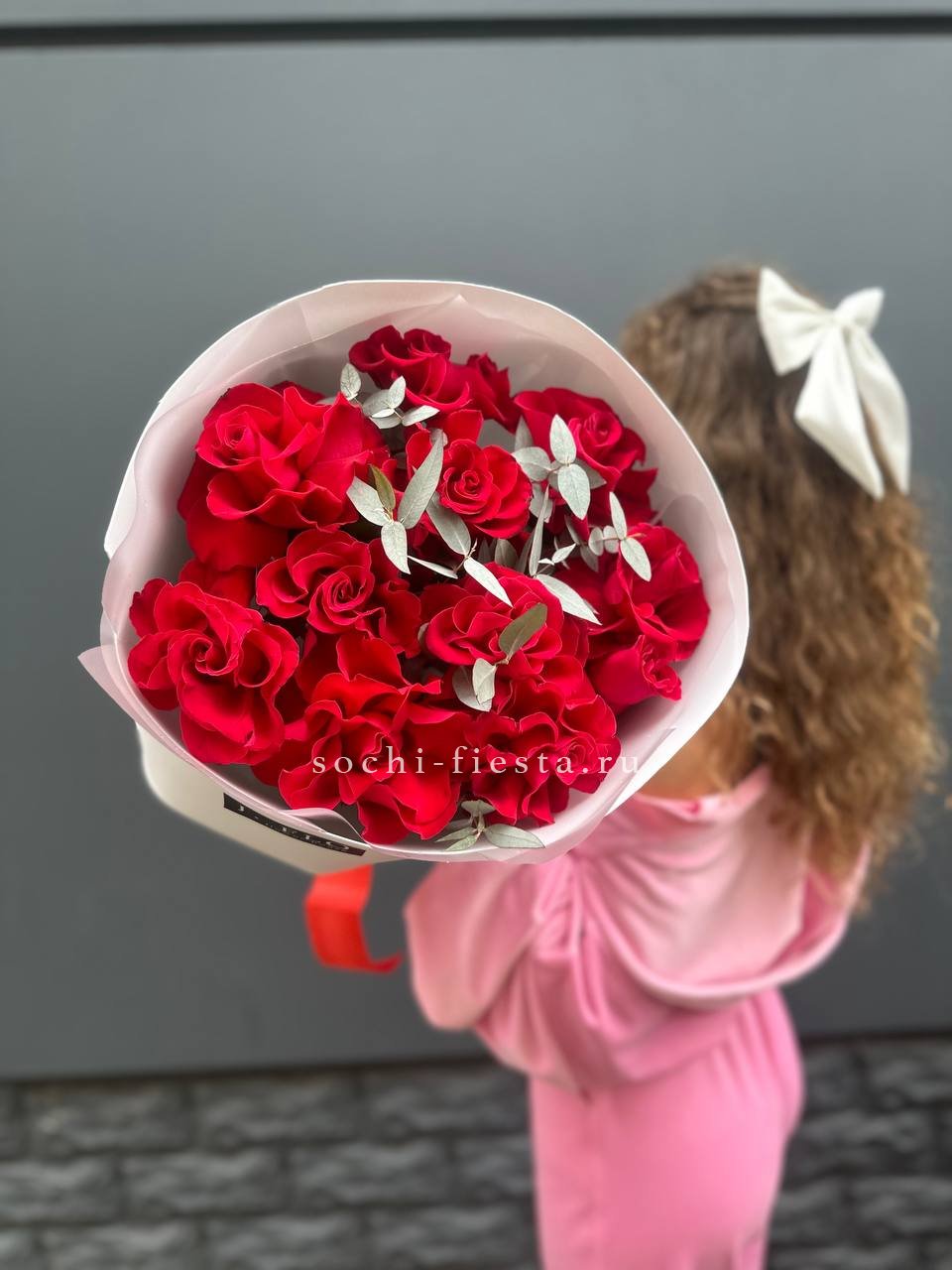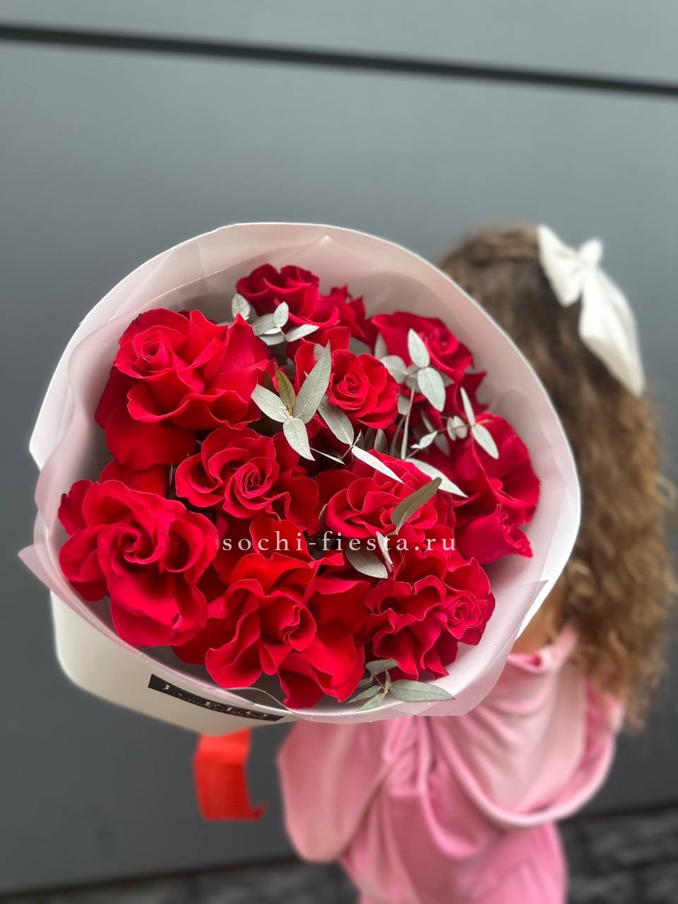 Одиннадцать роз сорта Naomi радуют глубоким красным оттенком и бархатистой поверхностью лепестков. Композиция выглядит свежо и уверенно в любом интерьере.