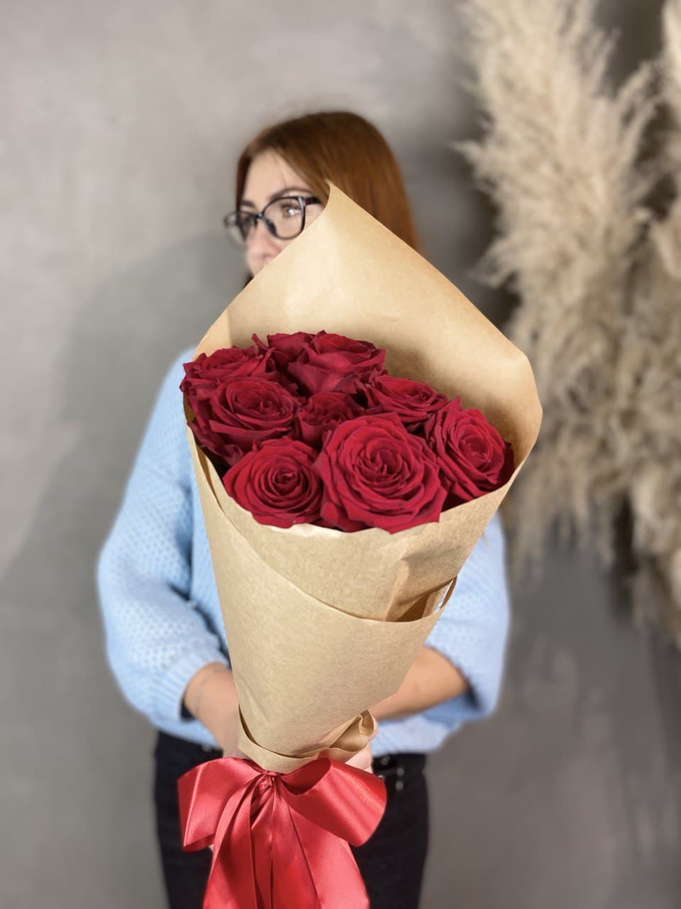 Пятнадцать красных роз в лаконичной упаковке держат безупречную вертикаль и собраны так плотно, что линия букета остаётся чёткой и графичной. Форма читается с любого угла и не теряет выразительности даже в высоких вазах.