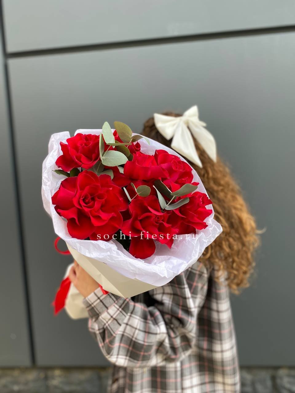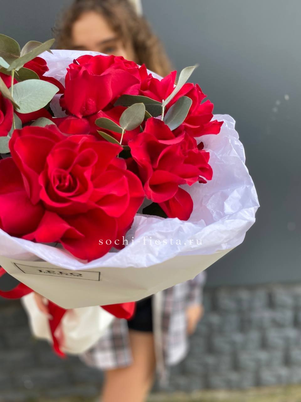 Семь французских роз с крупными бутонами и густой фактурой лепестков. Красный цвет звучит насыщенно и глубоко, а эвкалипт добавляет свежести композиции.