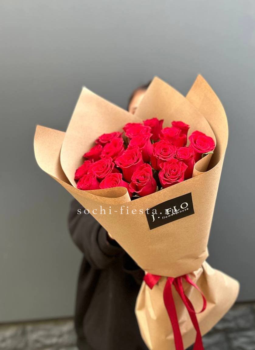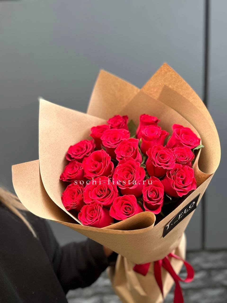 Девятнадцать роз с бархатными красными лепестками в лаконичной крафтовой упаковке. Естественная подача сохраняет свежесть линий и позволяет бутонам раскрыться в полную силу. Классика, которая работает всегда.