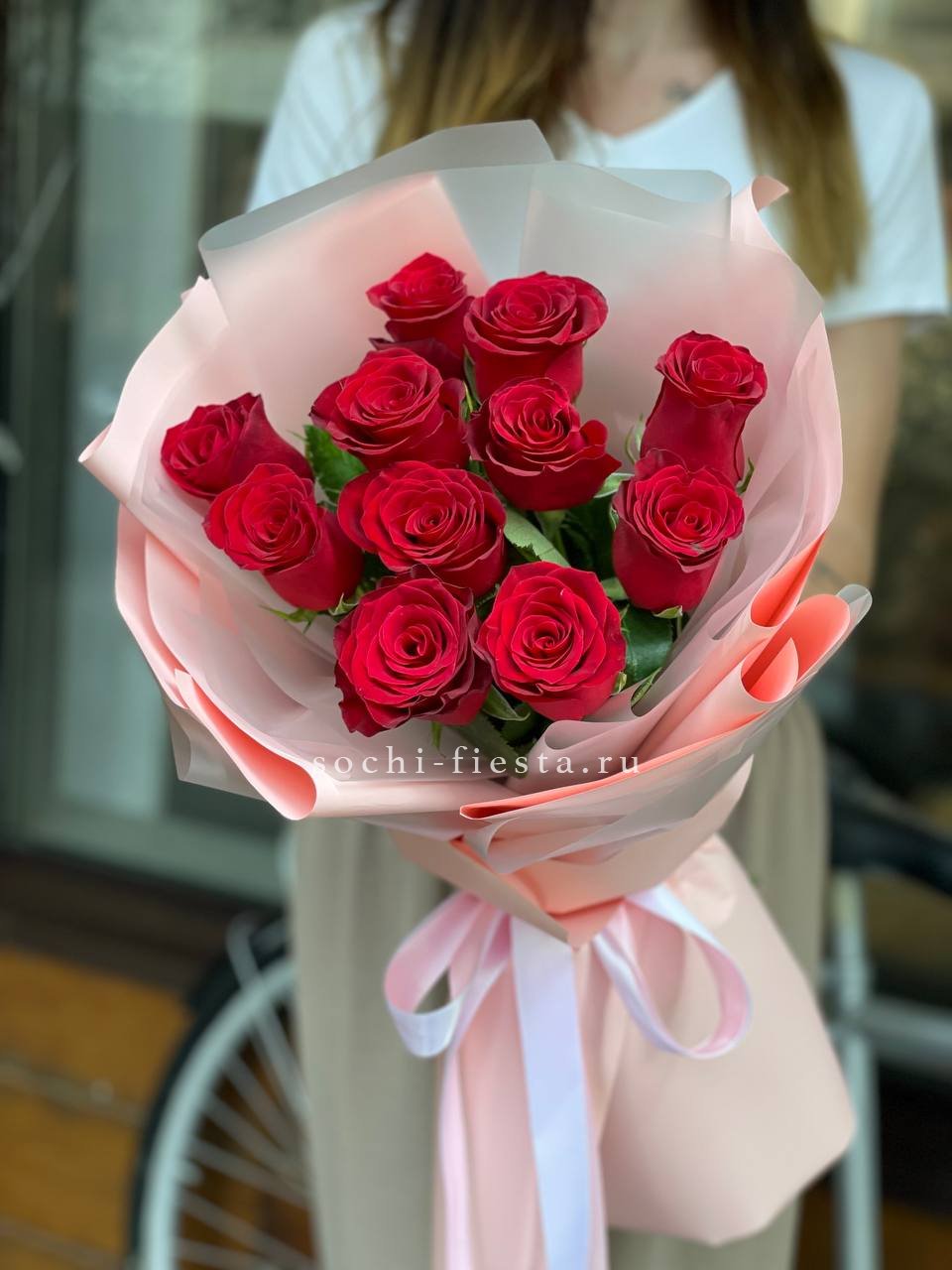 17 красных роз, лента, крафт или дизайнерская пленка.