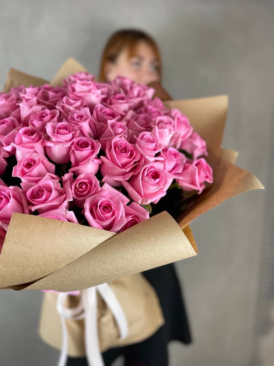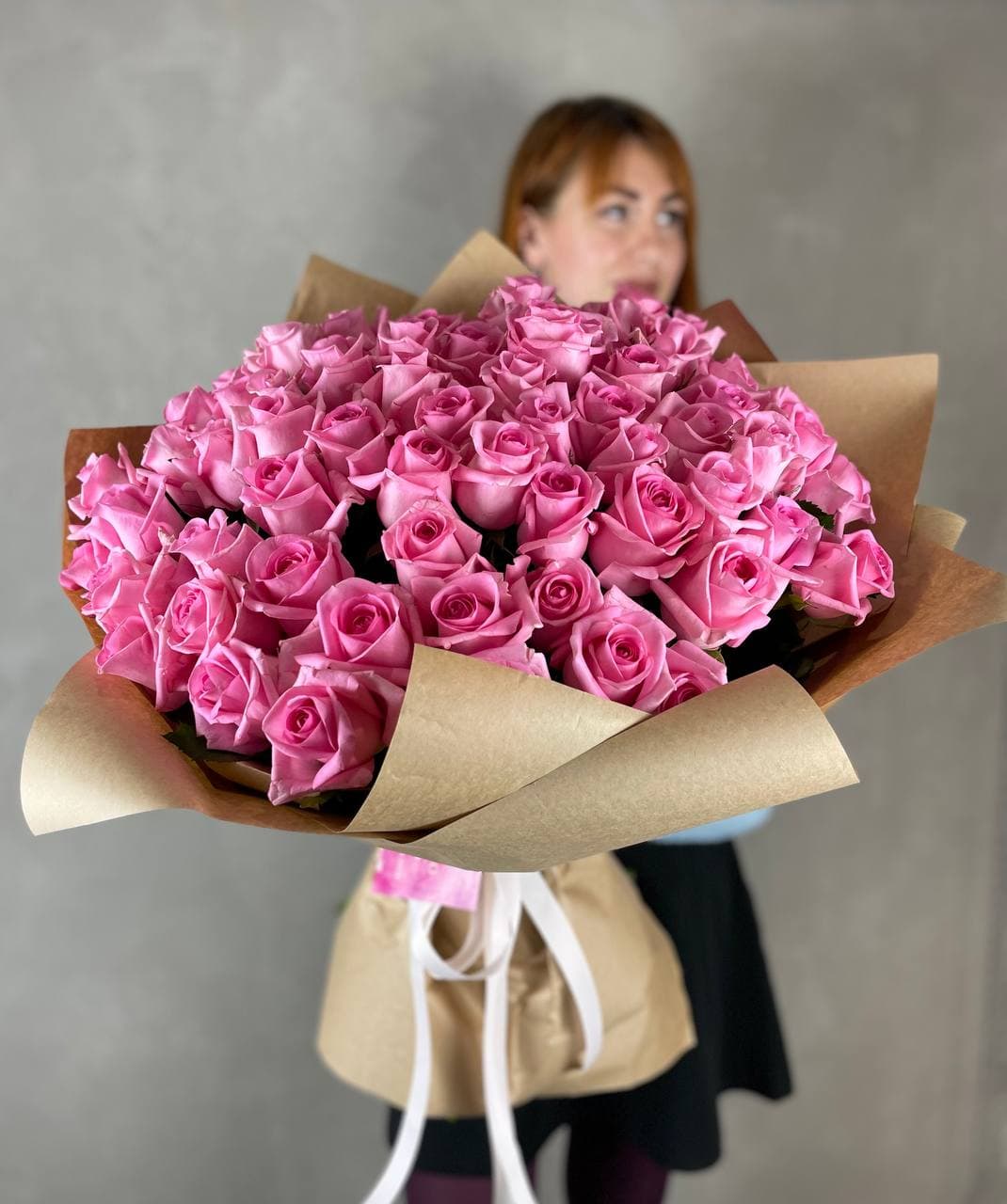 101 розовая роза, лента, упаковка на выбор.