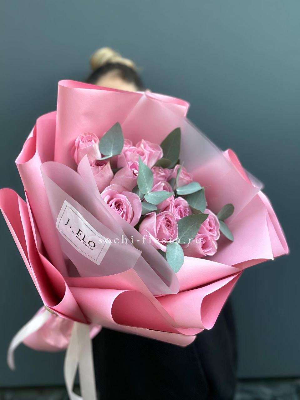 Семнадцать вывернутых роз открывают фактурную глубину лепестков и создают объемную композицию. Каждый бутон раскрывается по-своему, а эвкалипт добавляет воздушности общей форме.