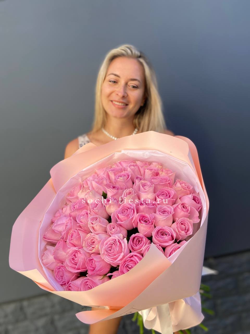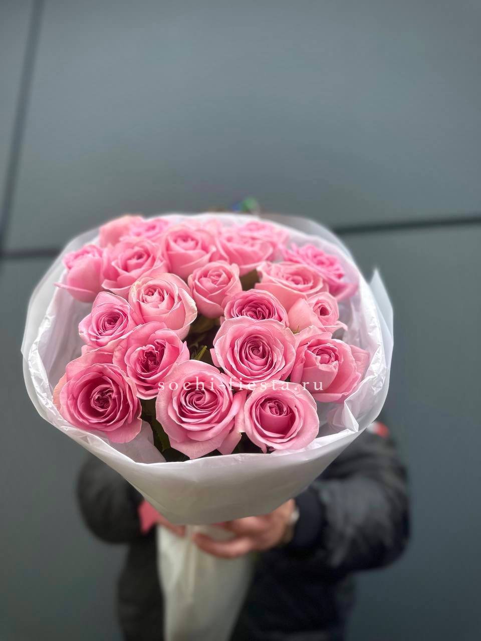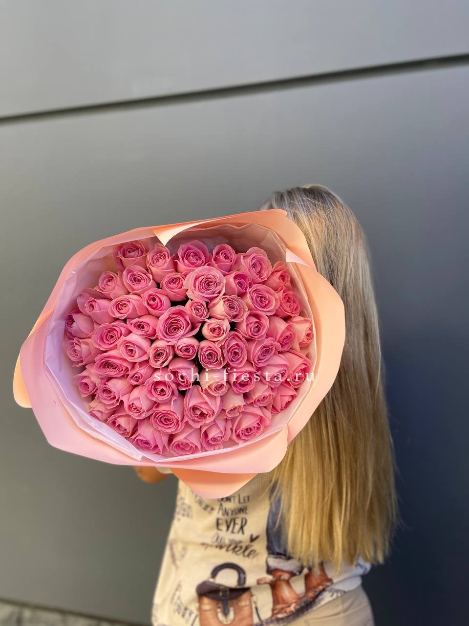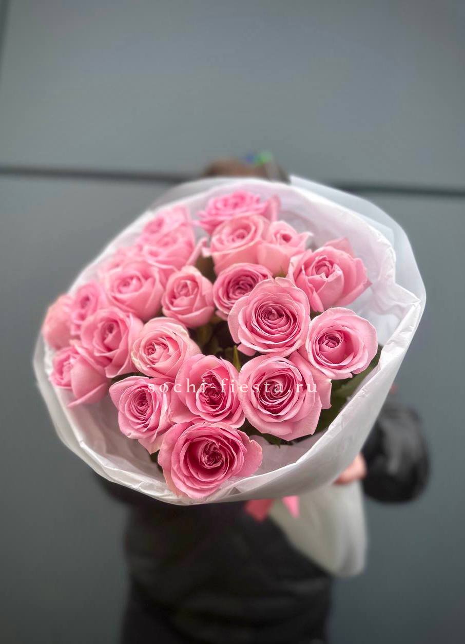 Двадцать одна роза в оригинальной упаковке с игривыми ушками создает настроение легкости и свежести. Розовые бутоны собраны в аккуратную композицию, которая удерживает форму и выглядит выразительно в любом интерьере.