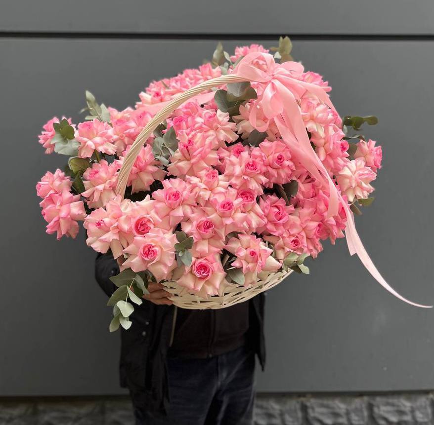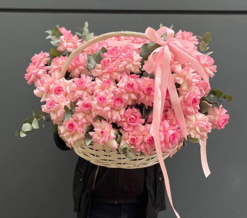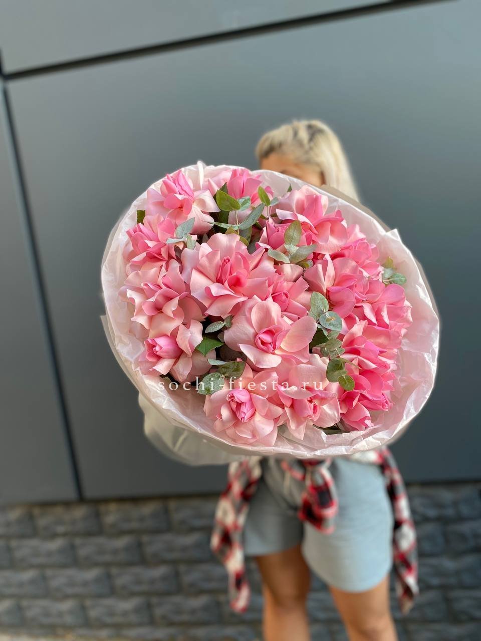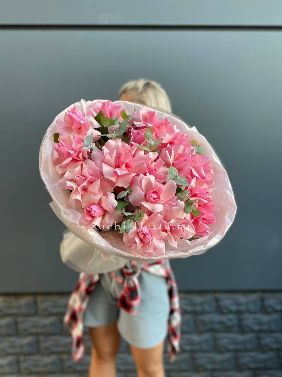 15 розовых роз, эвкалипт, дизайнерская упаковка.
