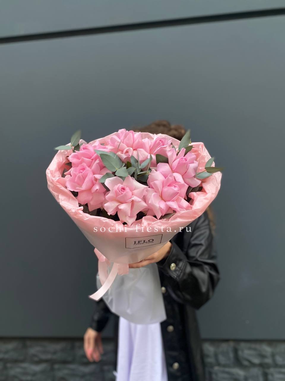 Семь вывернутых роз образуют компактную группу с чистым силуэтом. Ветки эвкалипта задают вертикальный ритм и добавляют воздуха между бутонами. Букет держит форму и выглядит собранно.