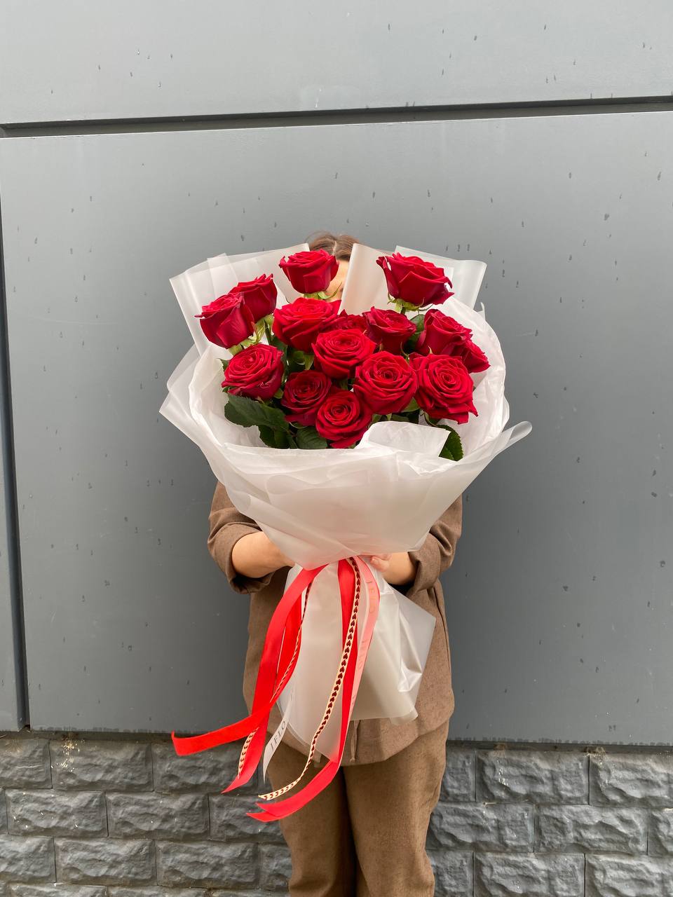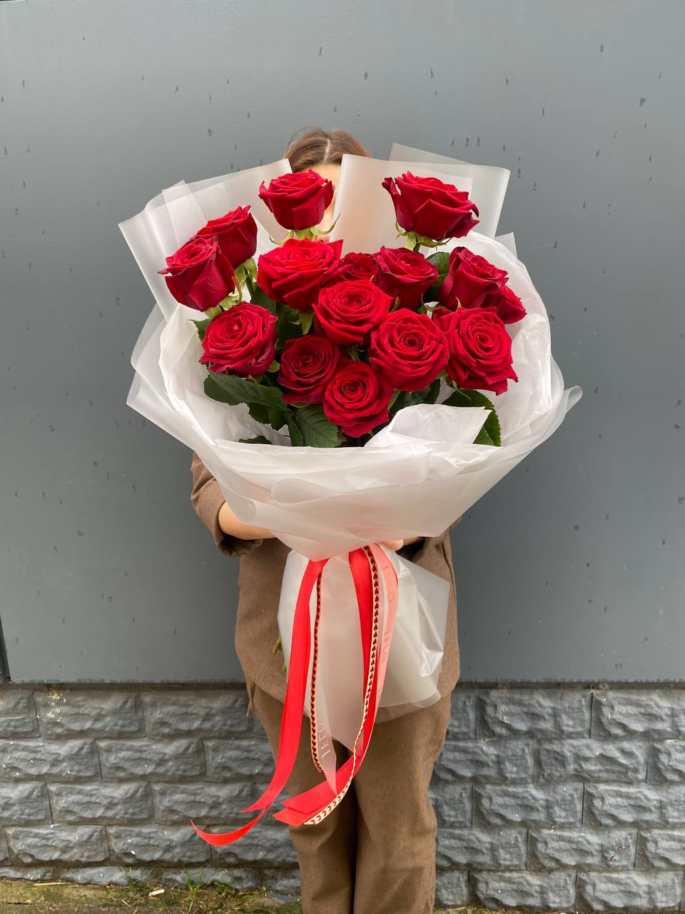 Пятнадцать красных роз на высоких стеблях собраны в лаконичный букет с чёткой формой. Насыщенный алый оттенок создаёт яркое визуальное пятно и держит внимание.