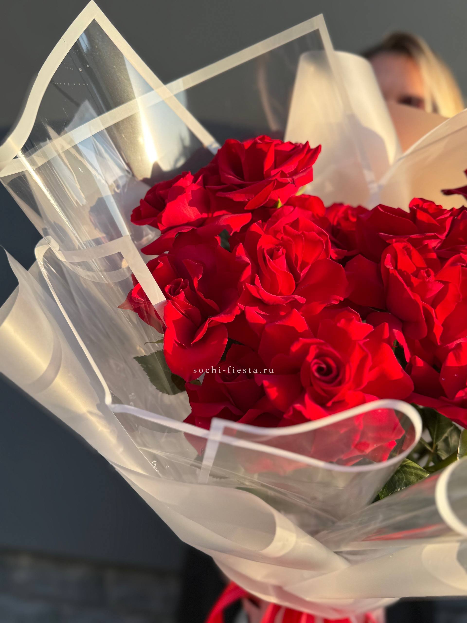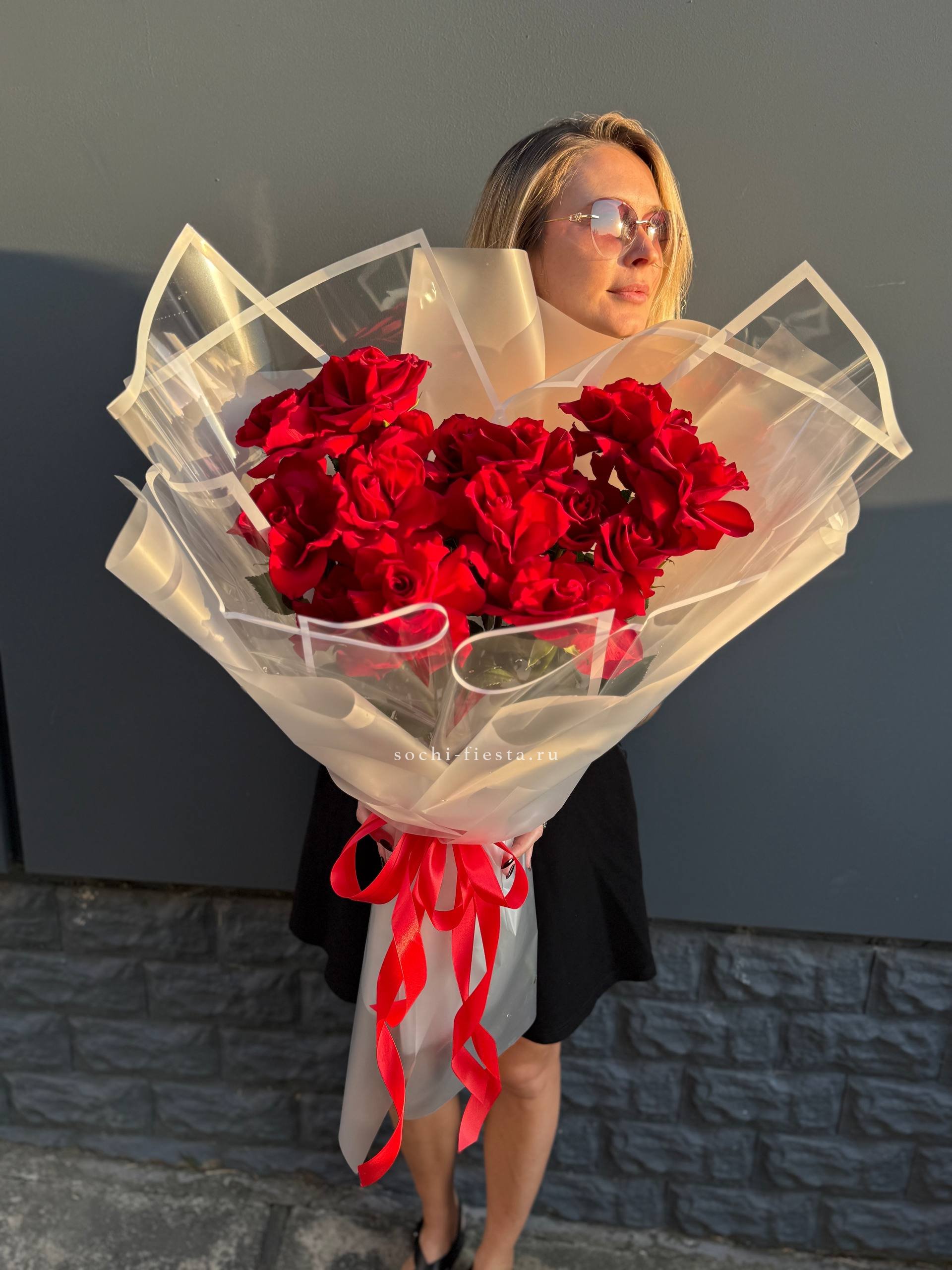 Двадцать пять красных роз с длинными стеблями держат форму и долго радуют свежестью. Классическая красная гамма звучит уверенно и ярко в любой обстановке.