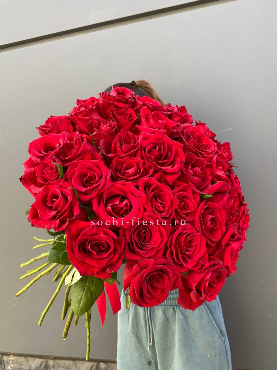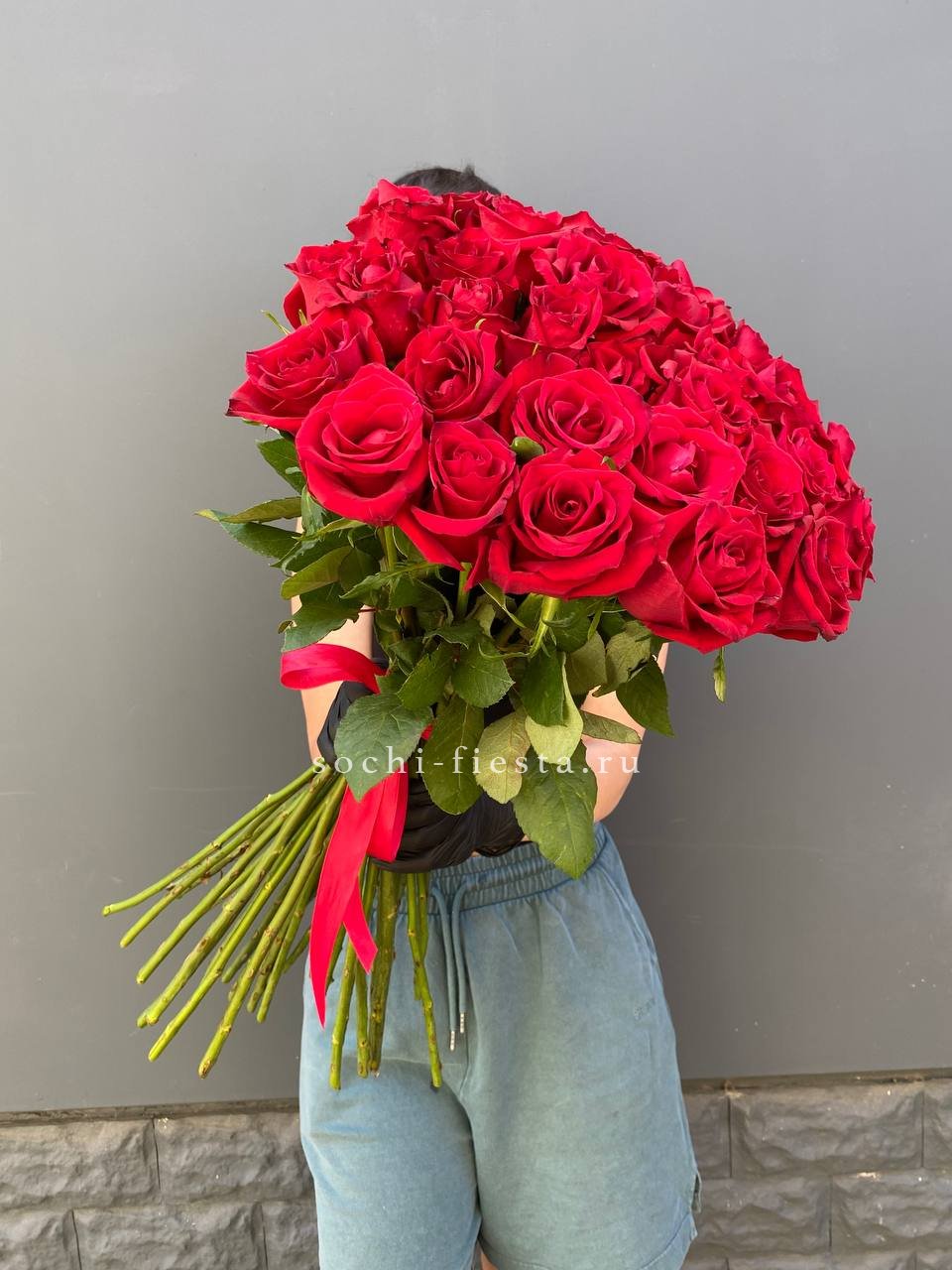 Двадцать пять бутонов выстраиваются в пышную композицию с чётким ритмом и объёмным силуэтом. Голландские розы создают впечатление монументальности и уверенной подачи.
