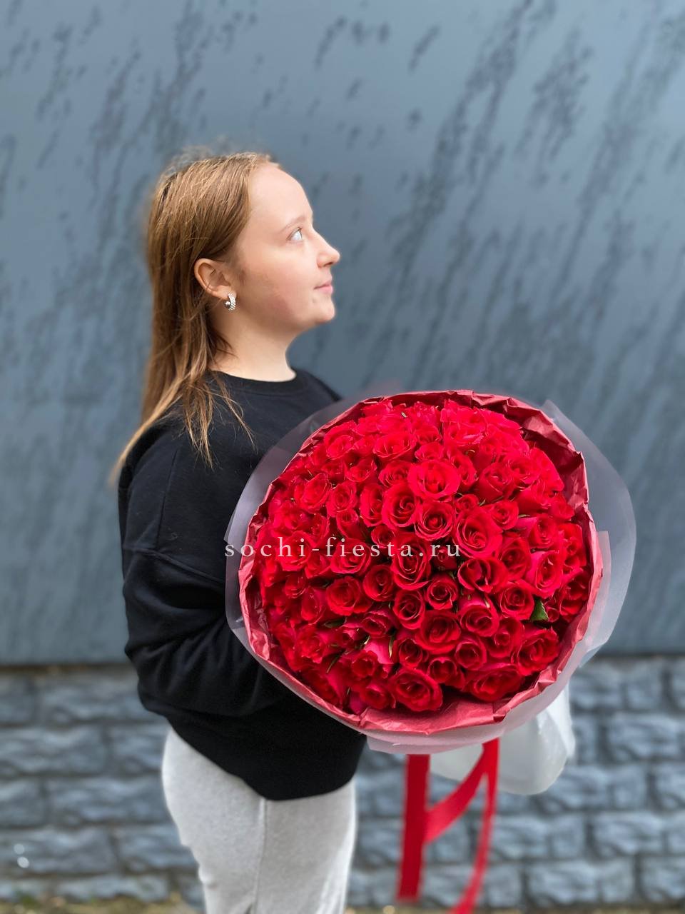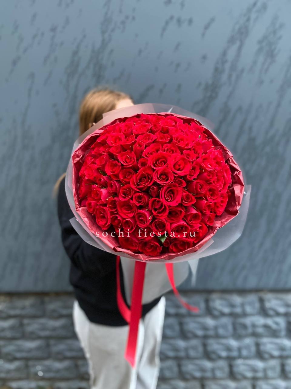 Сто одна красная роза хорошо сохраняет форму и долго радует свежестью бутонов. Плотная сборка обеспечивает аккуратный вид и удобство размещения в любом интерьере.