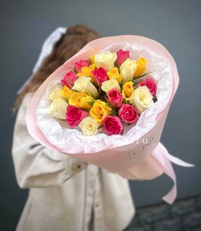 Разноцветные головки роз собраны в яркую композицию, где оттенки переплетаются без строгого порядка. Каждый бутон добавляет свой тон в общую палитру. Микс, который звучит живо и непредсказуемо.