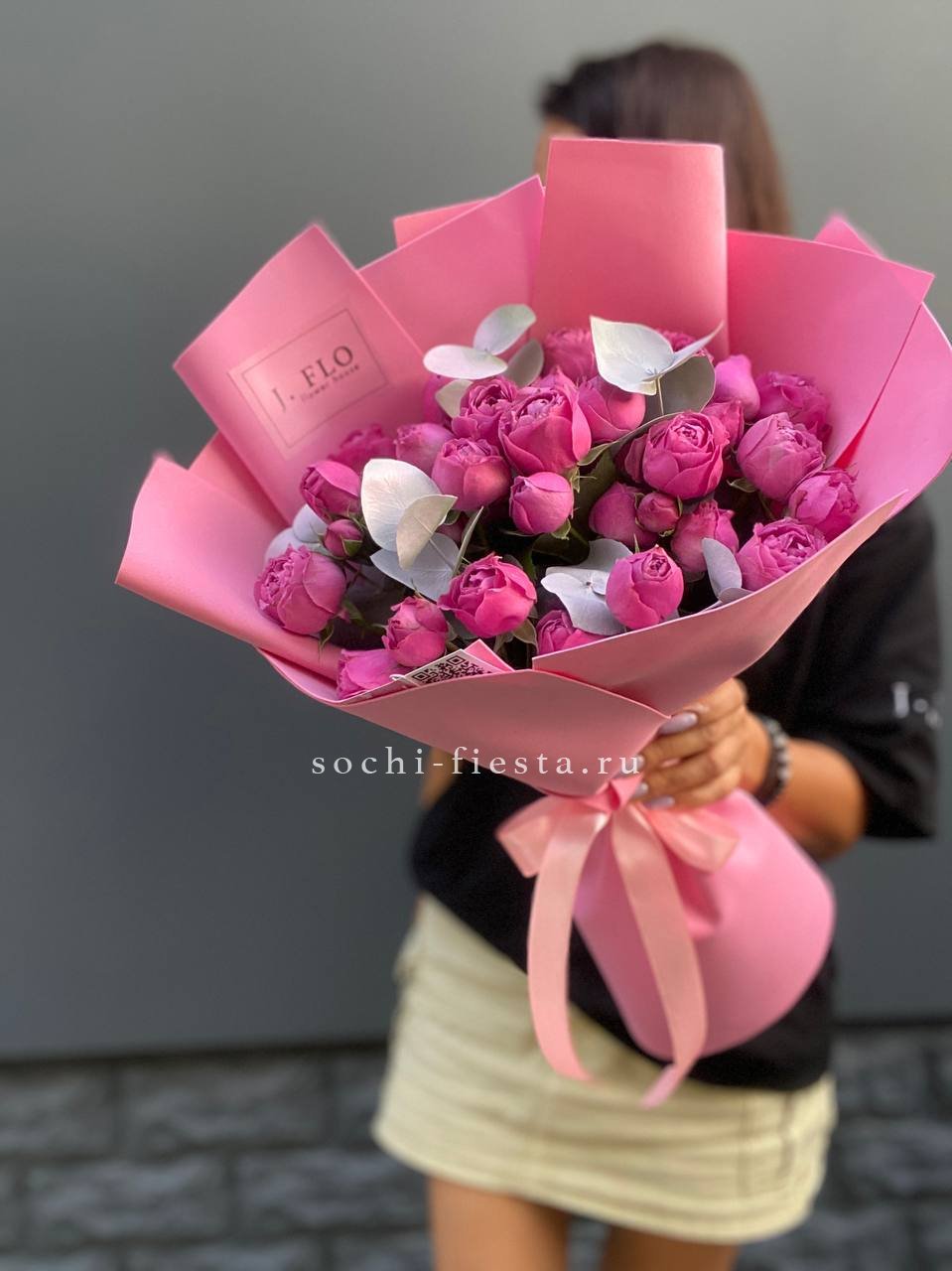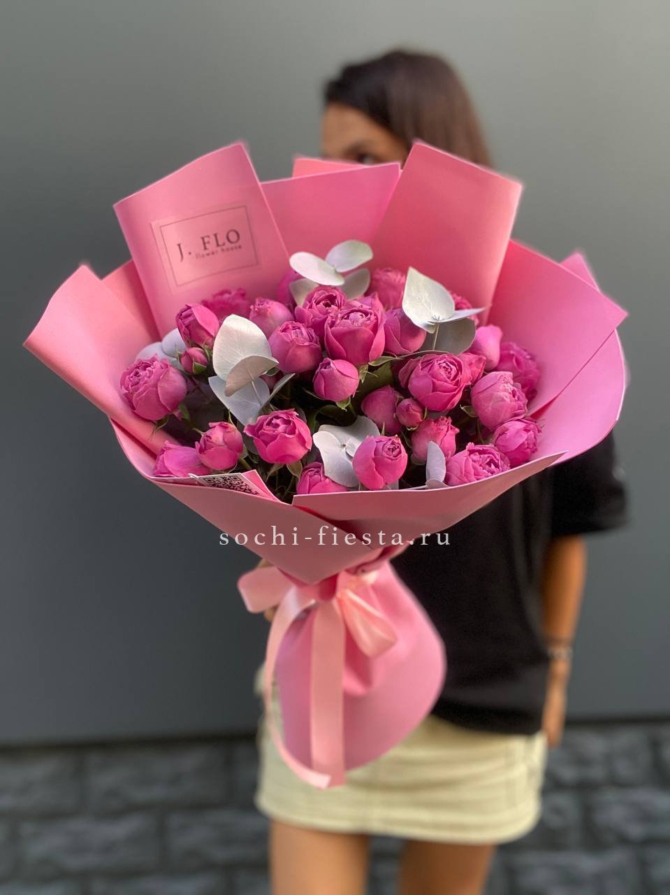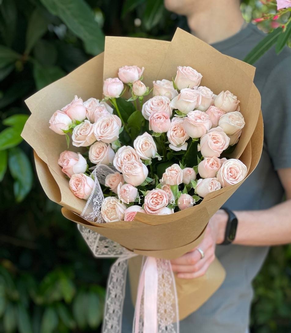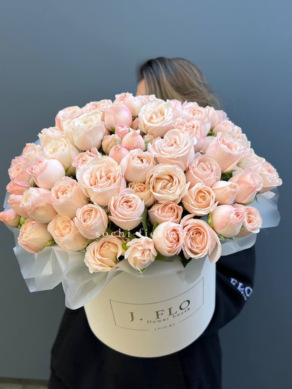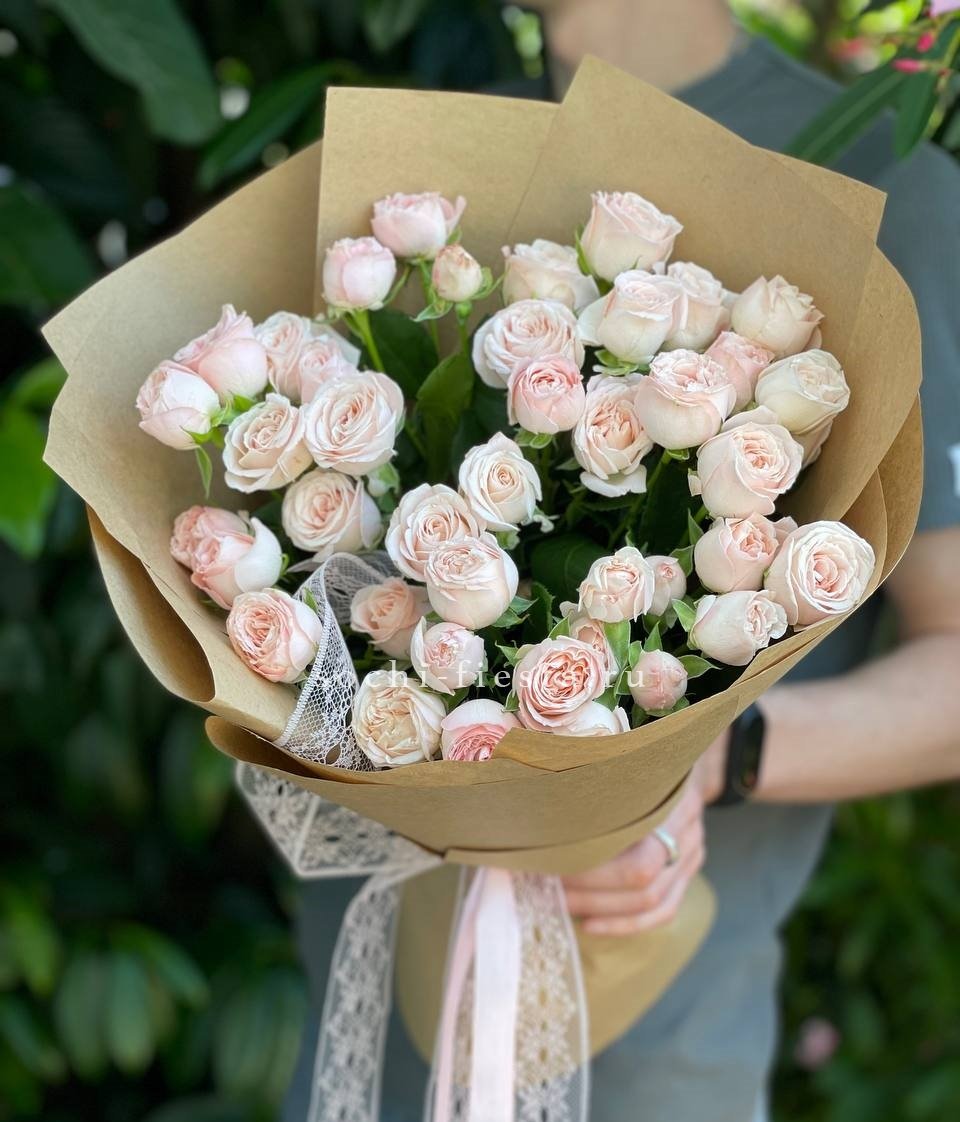55 роз сорта Misty bubbles и bombastic, лента, дизайнерская упаковка.