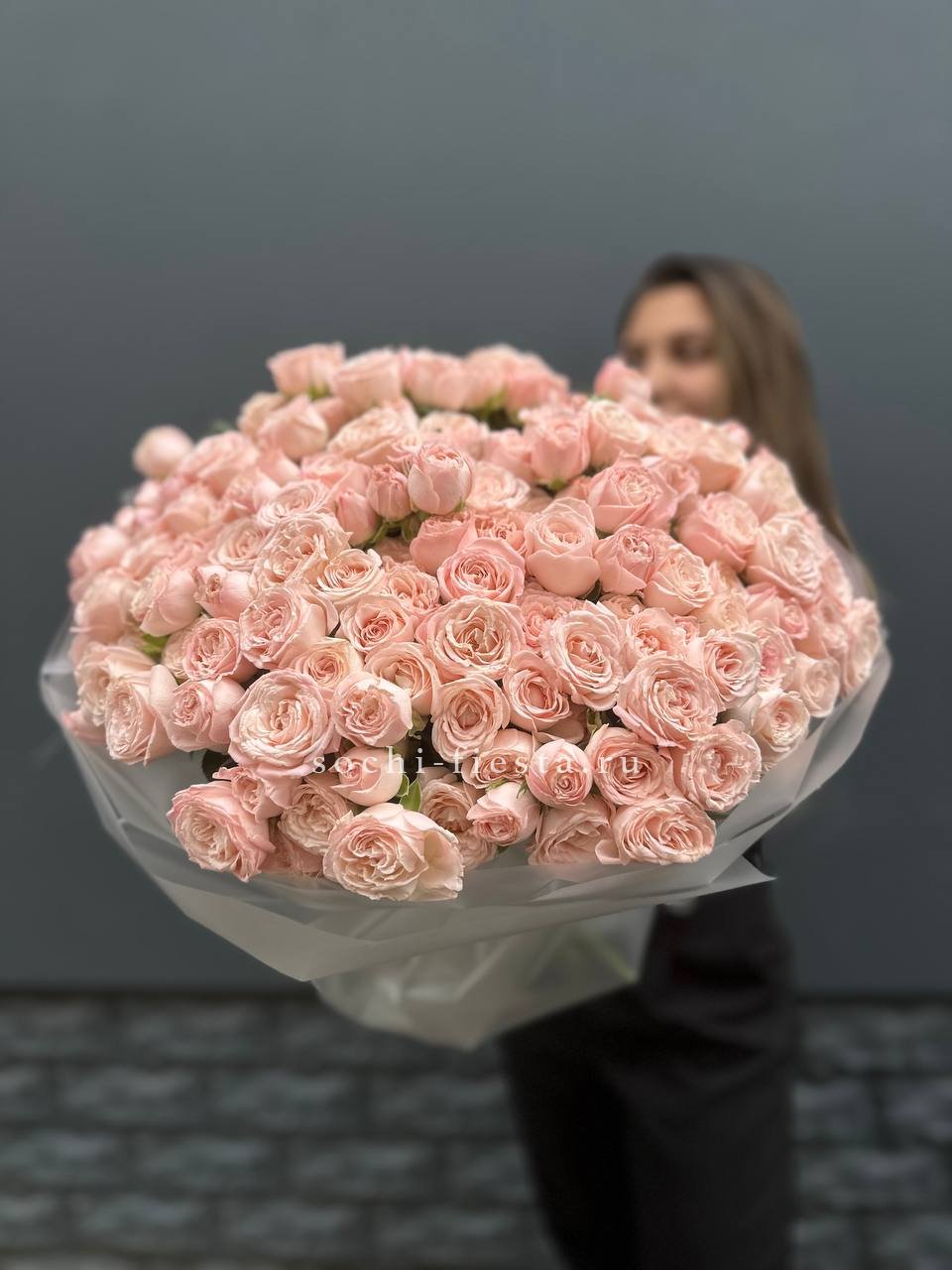 Пятьдесят один бутон сорта Бомбастик с густомахровыми лепестками кремового оттенка. Плотная сборка создает впечатляющий объем и заполняет пространство. Монобукет для тех моментов, когда важен масштаб.