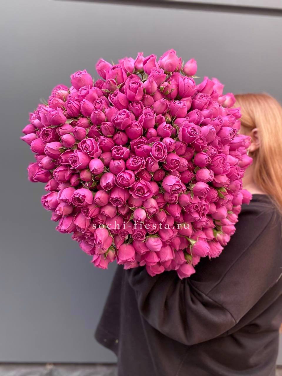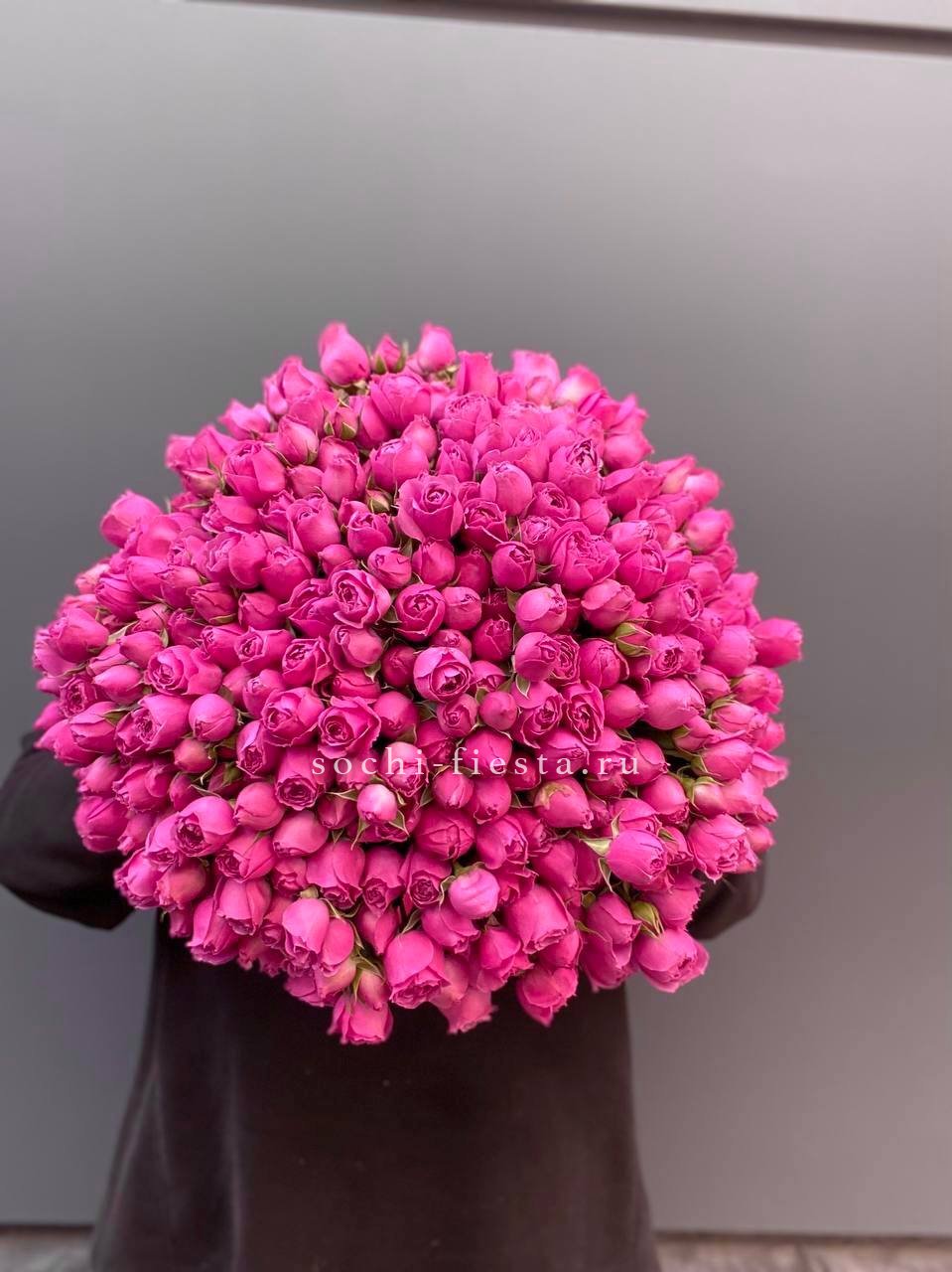 Розовые розы Бомбастик с пышными бутонами образуют воздушную охапку. Цвет переливается от нежного до яркого в зависимости от света. Композиция выглядит живой и естественной.