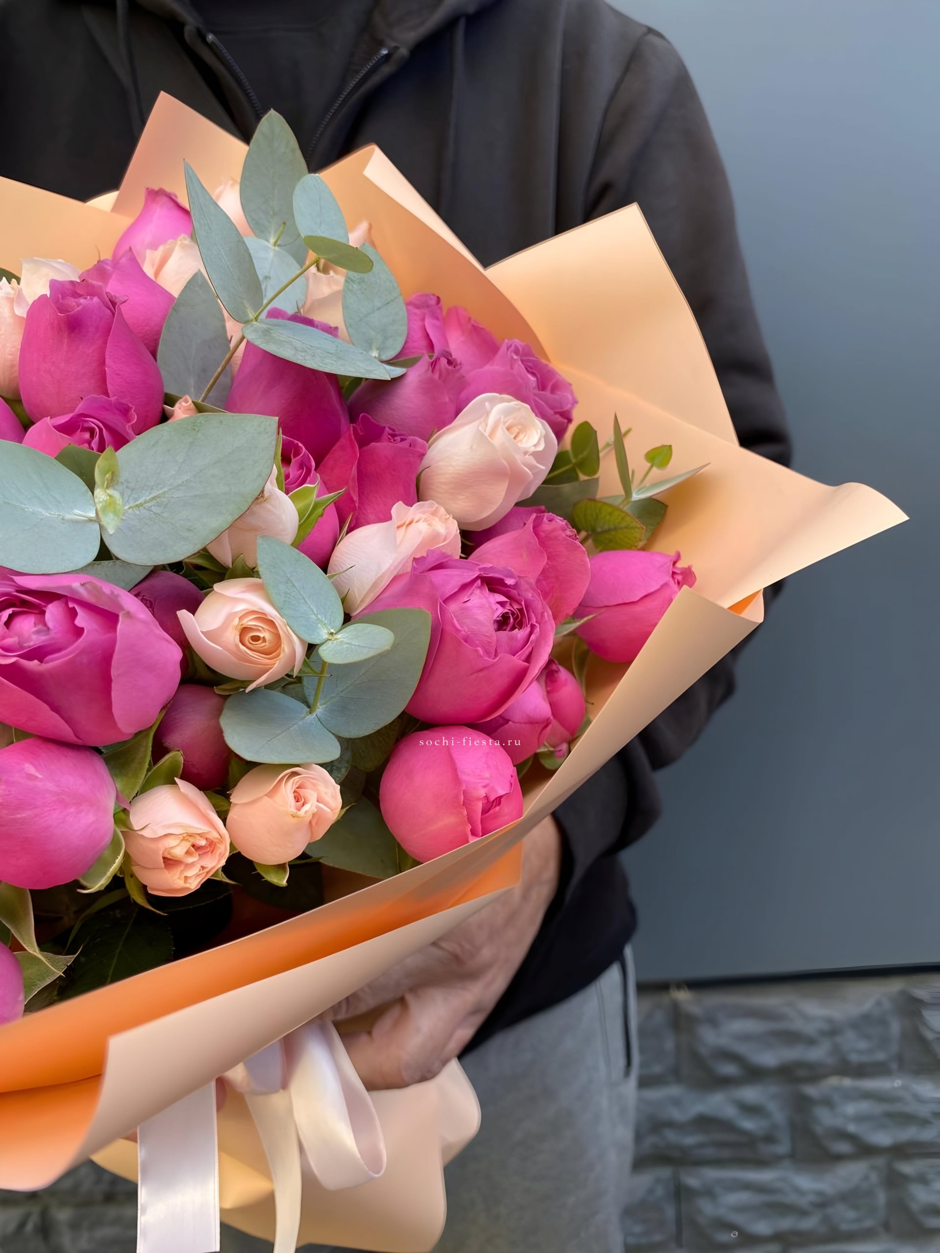 Пятнадцать роз Мисти Бабблс с пышными многослойными бутонами создают объёмную композицию с живой текстурой. Лепестки раскрываются волнами, образуя плотную шапку с мягкими переходами оттенков. Веточка эвкалипта добавляет свежести и завершает образ.