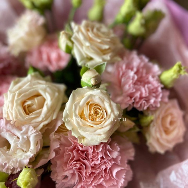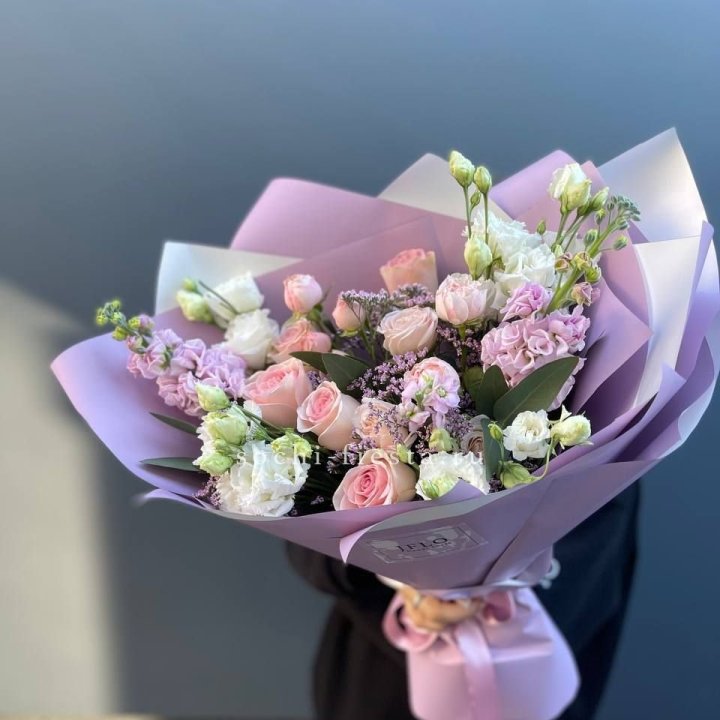 Состав сборных букетов в Тюмени: розы (Freedom, Mondial), хризантема кустовая, альстромерия, эустома, фрезия. Дополнительно в сезон — тюльпаны, нарциссы, ранункулюсы, ирис. Поставки в Тюмени раз в 3-5 дней из ближайшего регионального центра. Флорист планирует ассортимент под дату поставки и знает, что будет в наличии к нужному дню.