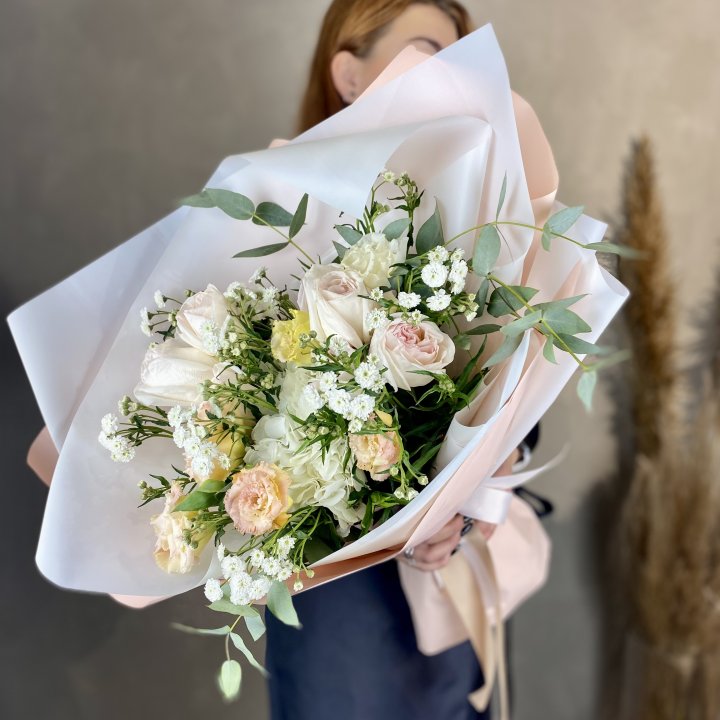 В Тюмени сборный букет — один из главных флористических форматов. Небольшой город не нуждается в авангарде и экспериментах: здесь ценят понятное, красивое и живое. Сборный букет с розами, хризантемами и сезонными акцентами — то, что флорист в Тюмени делает изо дня в день, и делает хорошо.