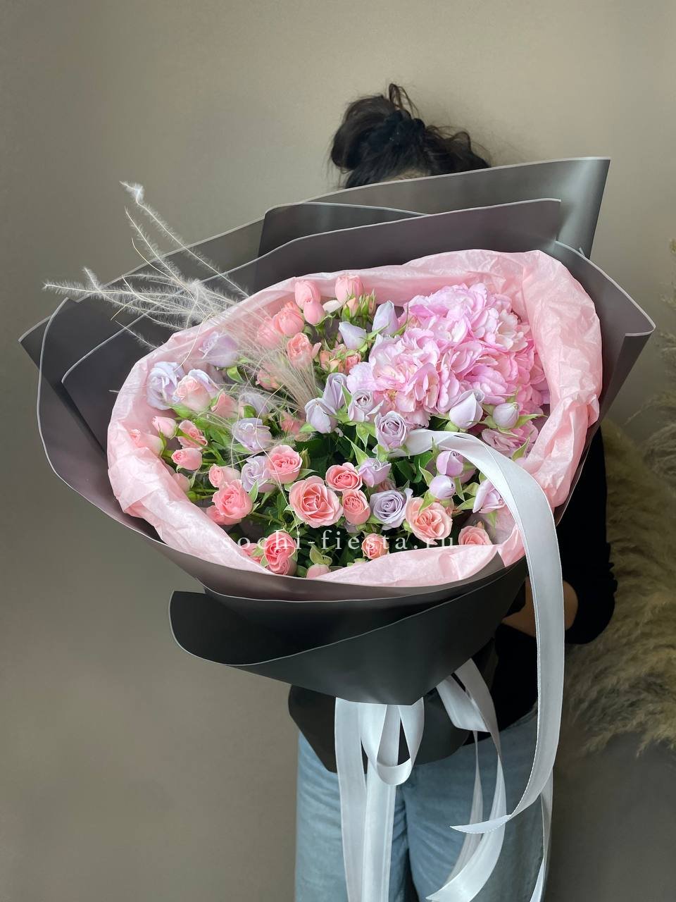 маттиола, розы, гортензия, диантусы, хризантемы , лента и дизайнерская пленка.