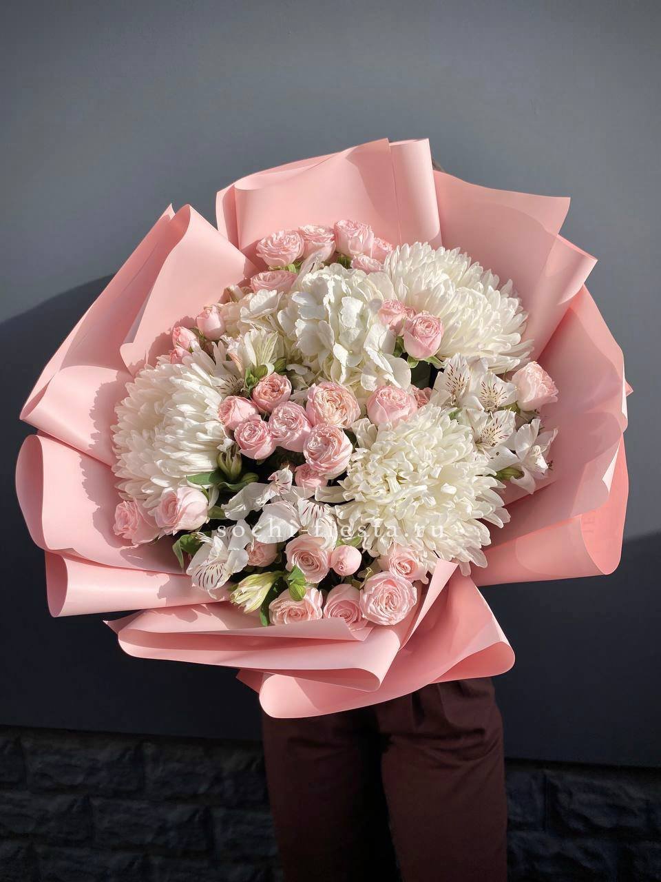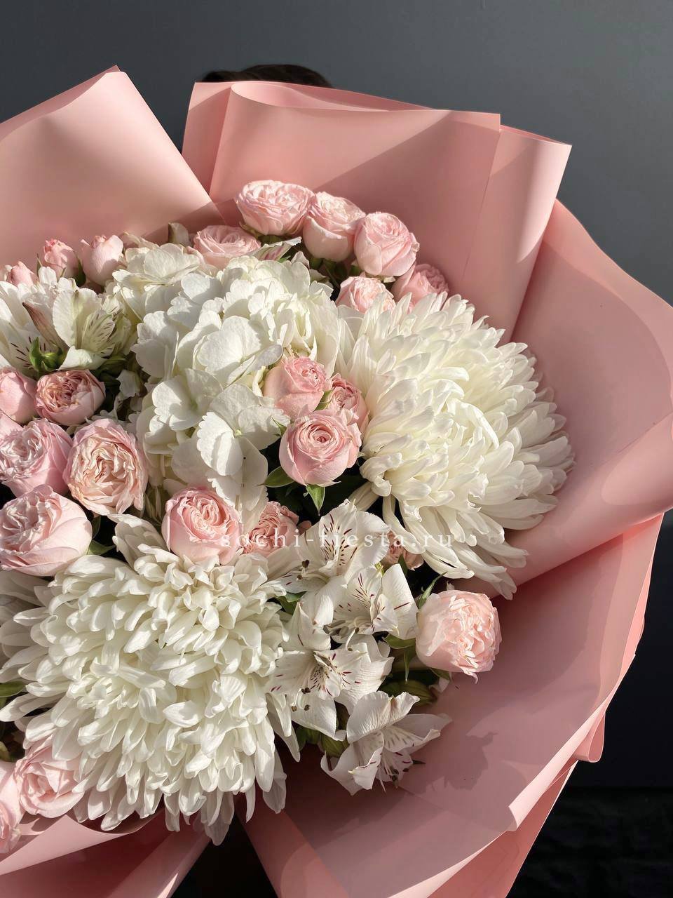 гортензия, одноголовые хризантемы, кустовые розы, альстромерии, лента и дизайнерская пленка.
