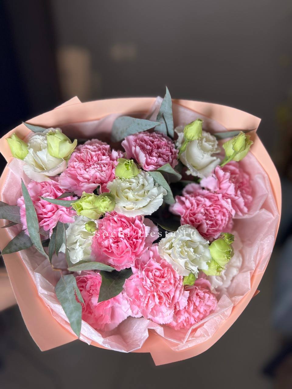 Воздушные соцветия эустомы переплетаются с яркими головками диантусов, создавая живую графику в обёртке. Каждый бутон раскрывается по-своему, добавляя композиции объём и движение. Букет для тех, кто ценит свежесть без лишних деталей.