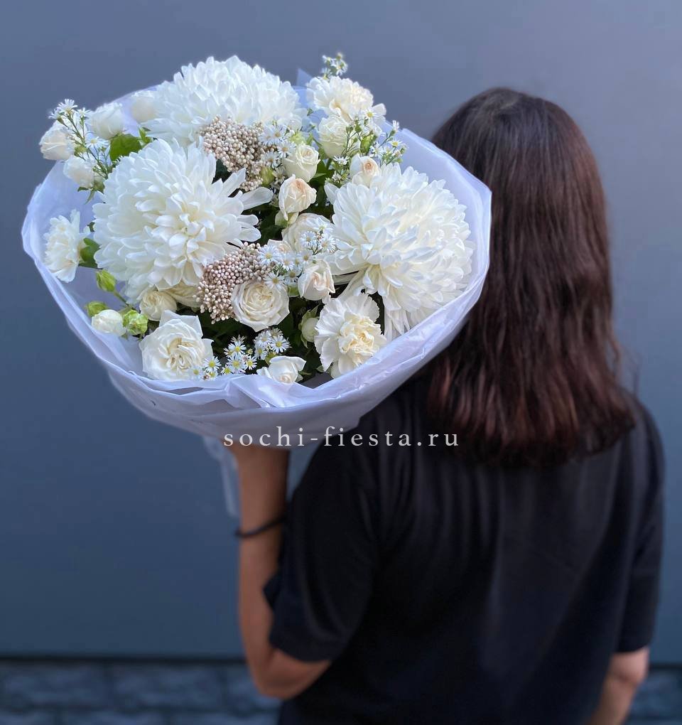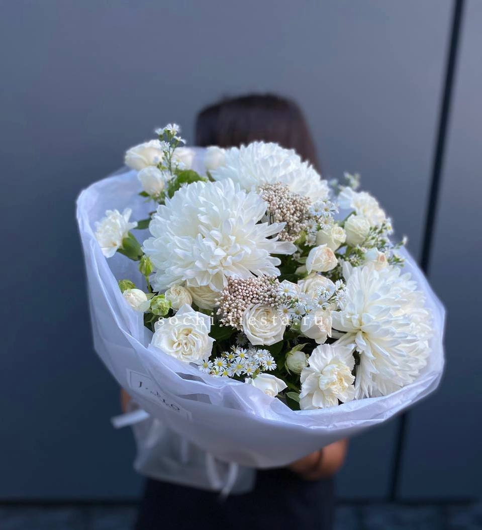 Белые хризантемы и кустовые розы собраны в плотную сферу, которая читается цельным светлым пятном. Матрикария и озотамнус заполняют пространство между бутонами, создавая ощущение снежного облака.