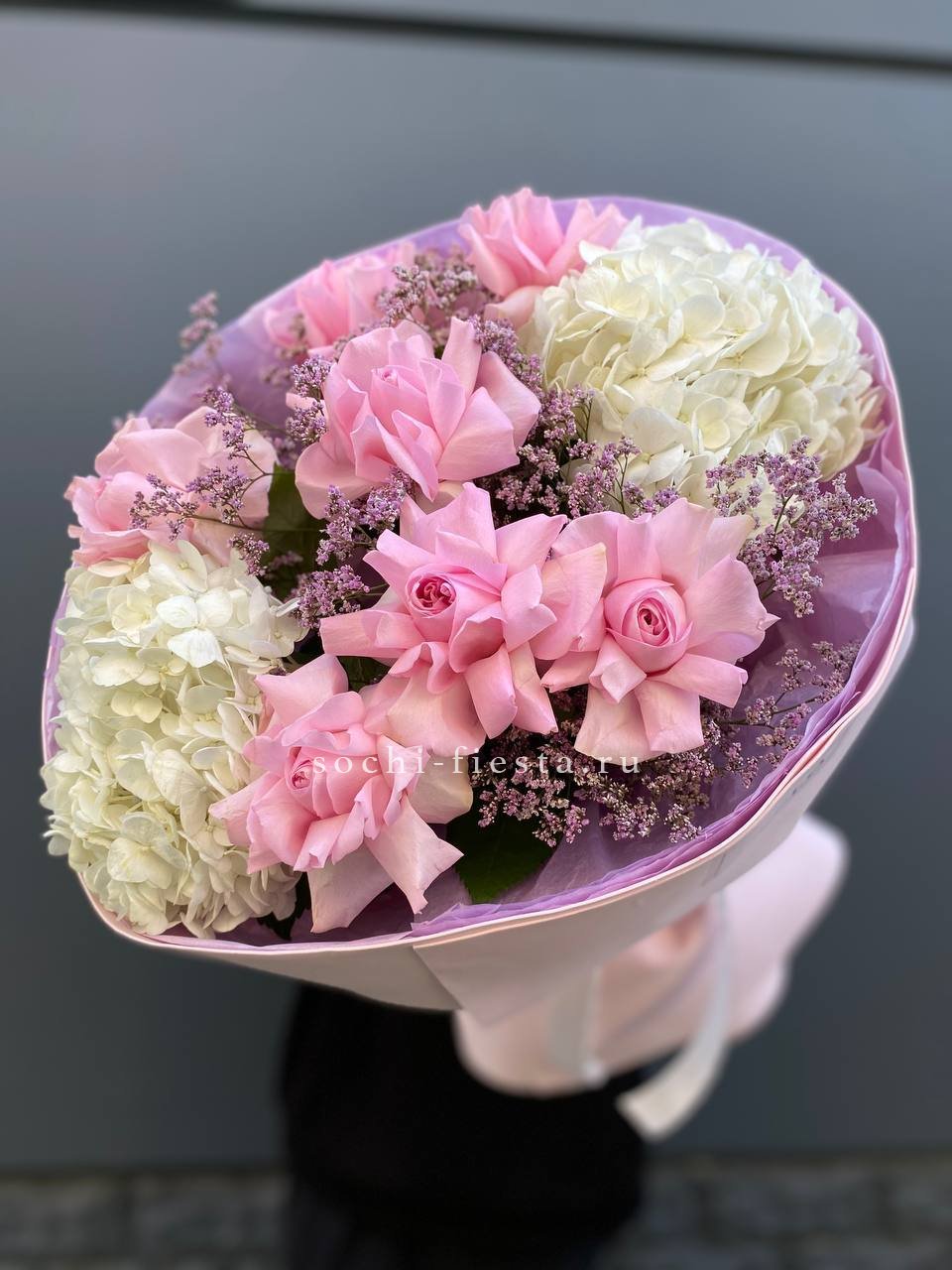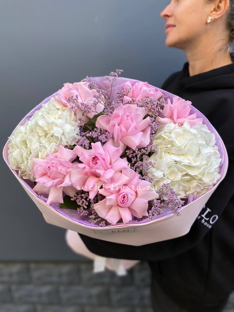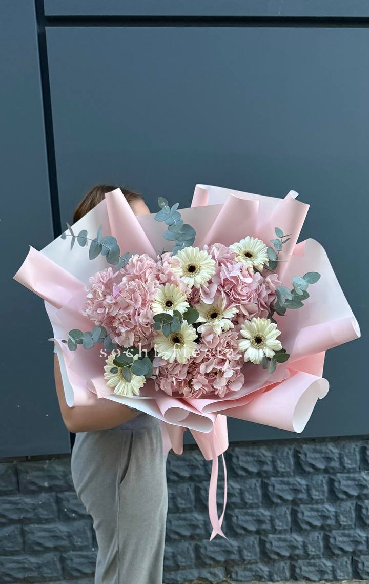 гортензия, диантус, хризантема, эустома, розы, озатамус, пленка.