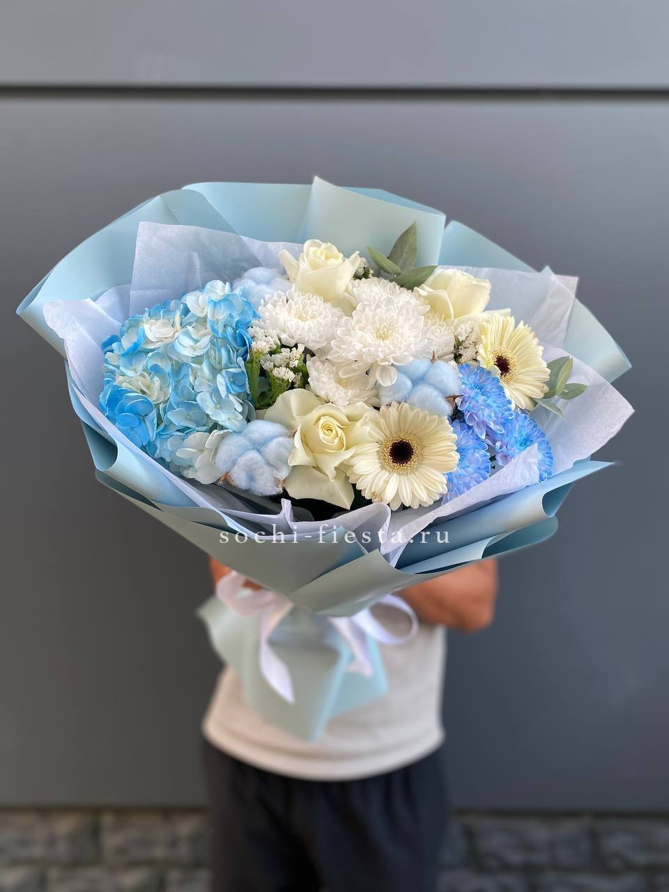 Яркая композиция объединяет пышную гортензию, игривые соцветия диантуса и солнечные хризантемы. Бомбастик добавляет объёма, а озотамнус создаёт лёгкую воздушность между крупными бутонами. Букет радует глаз насыщенными красками и жизнерадостным характером.