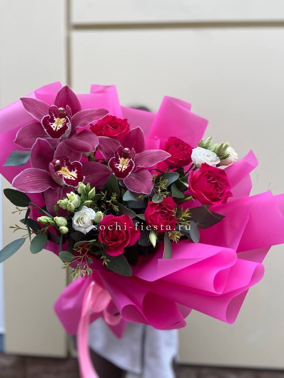 Плавные линии соединяют розы и орхидеи в единую волну. Эустома добавляет воздушности между крупными бутонами, а эвкалипт создает графичный каркас по краям композиции.