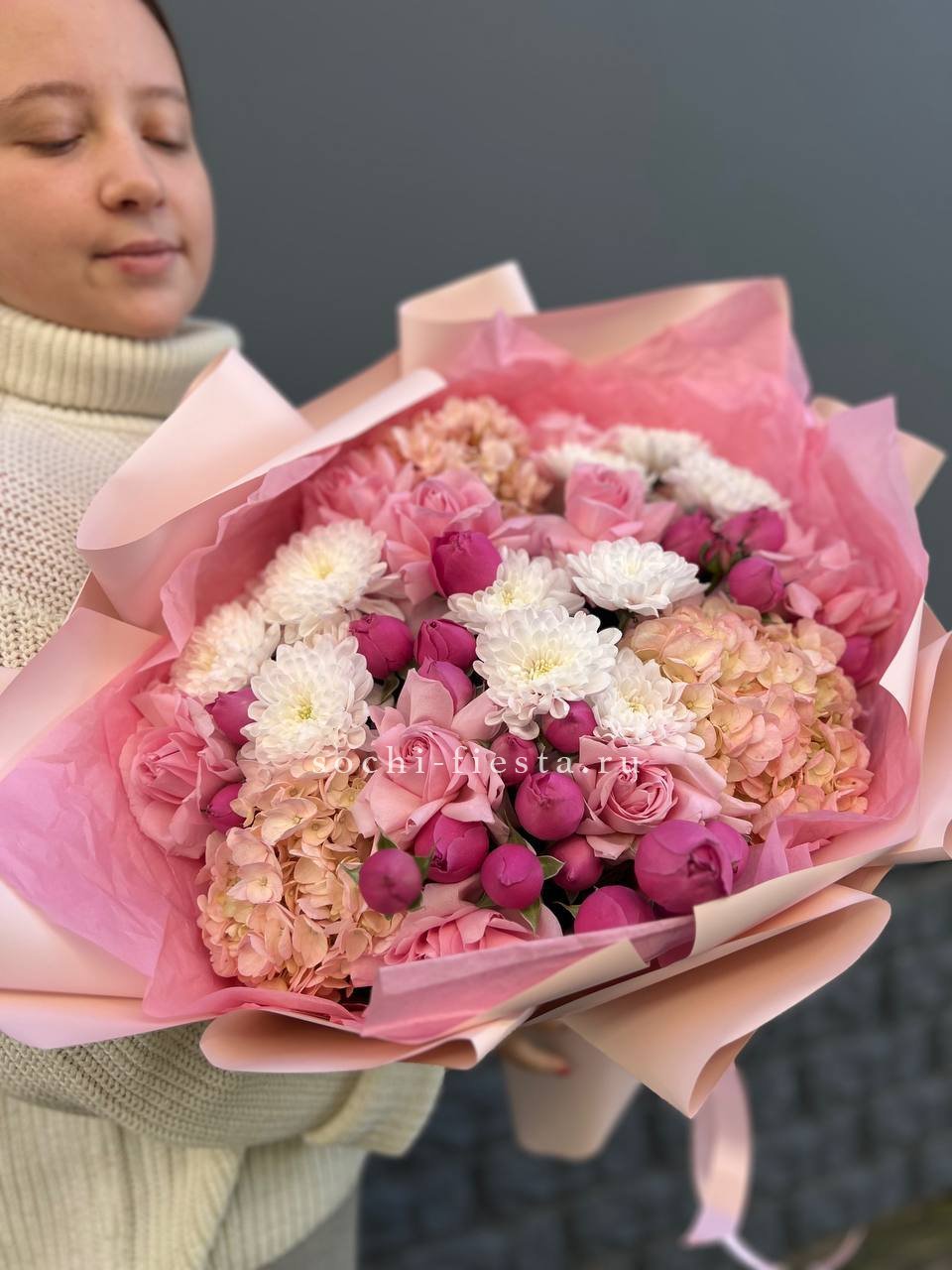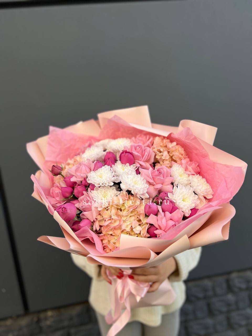 гортензия, белая роза, диантус, хризантема, эустома, озатамус, пленка.