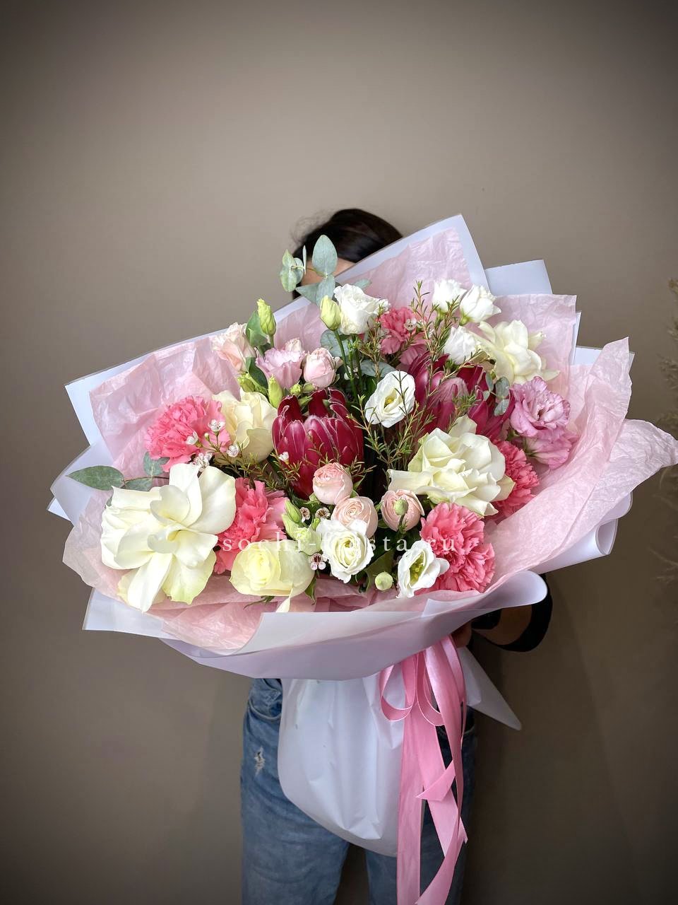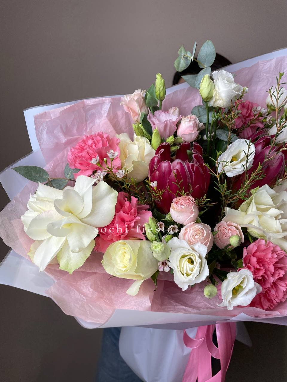 розы, пионовидные розы, эустома, диантусы, гортензия, эвкалипт, лента, фоамиран, тишью.
