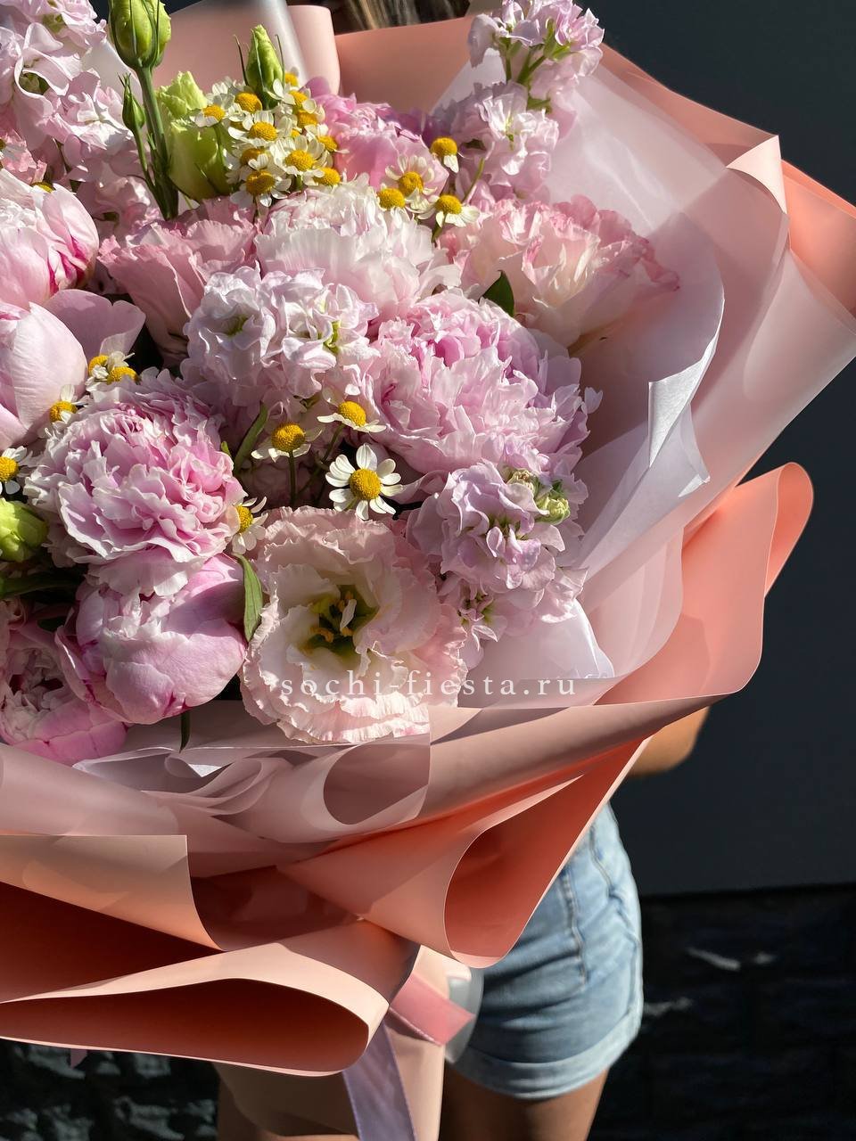 розовые пионы, эустома, ромашки, лента, дизайнерская упаковка.
