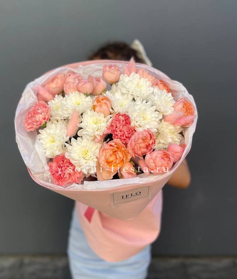кустовые розы, хризантемы, диантусы, лагурус, лента и дизайнерская пленка.