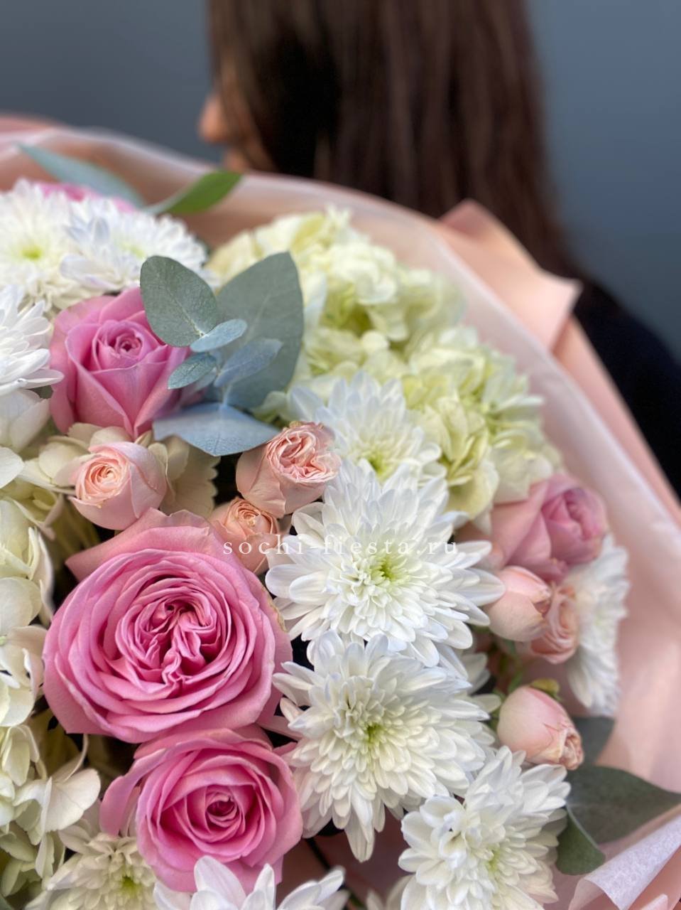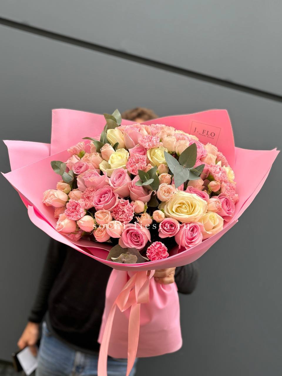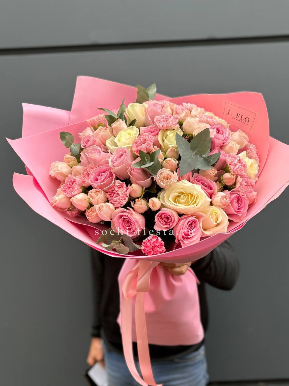 розы одноголовые, кустовые розы, озотамнус, диантусы, эвкалипт, лента, дизайнерская упаковка.