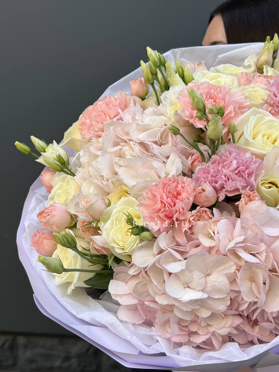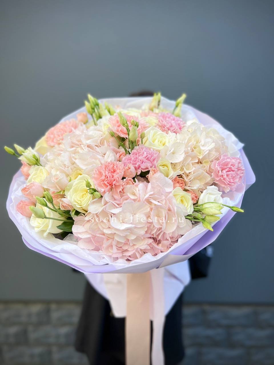 гортензия, пионовидные розы, эустома, эвкалипт, вспомогательный декоративный цветок, лента, дизайнерская упаковка.