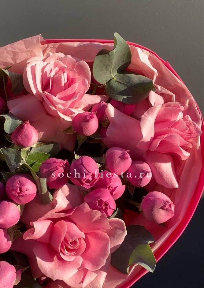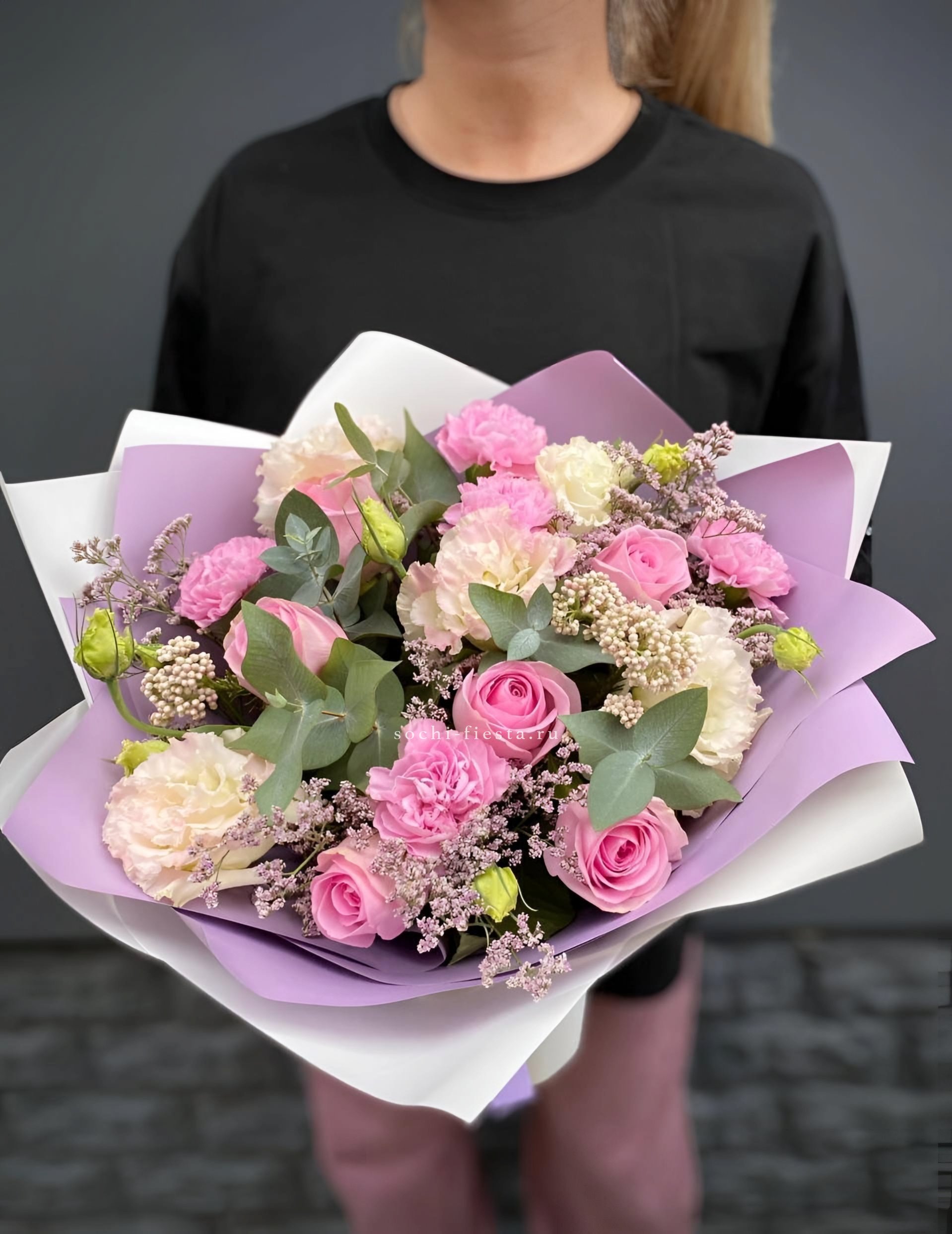 Пионовидные розы и гортензия образуют плотное ядро композиции, а диантус с эустомой разворачиваются по краям. Эвкалипт задает движение и глубину всей формы.