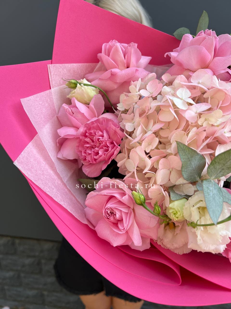 розовые розы, белые розы, диантус, бомбастик, гортензия, эвкалипт, пленка.