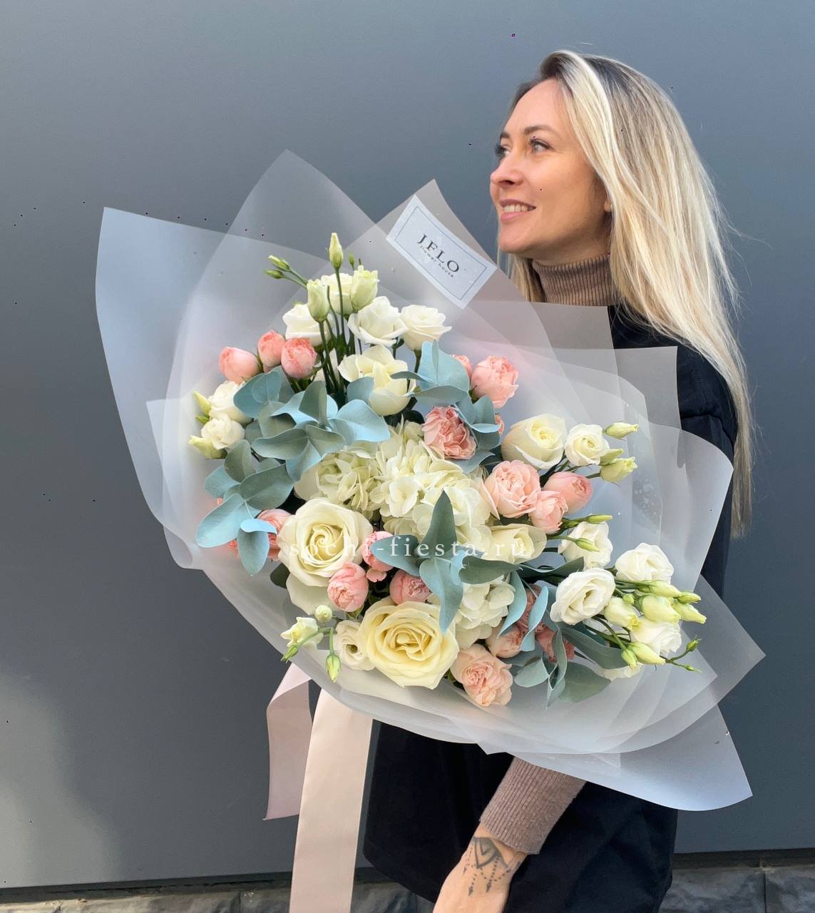 Этот пышный и по-настоящему масштабный букет — идеальный пример авторской флористики, где объем сочетается с невероятной нежностью.
