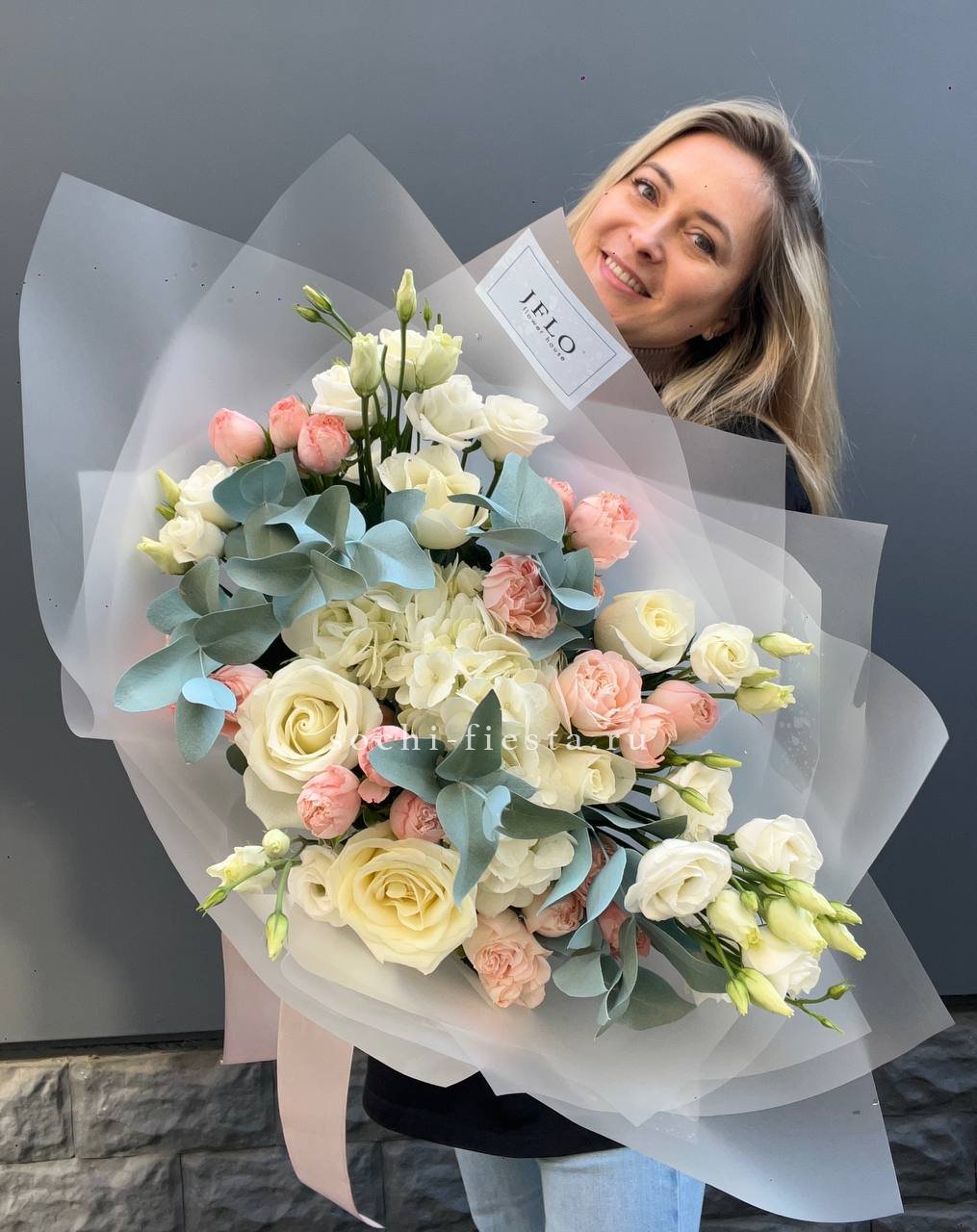 гортензия, эустома, диантус, эвкалипт, пленка.