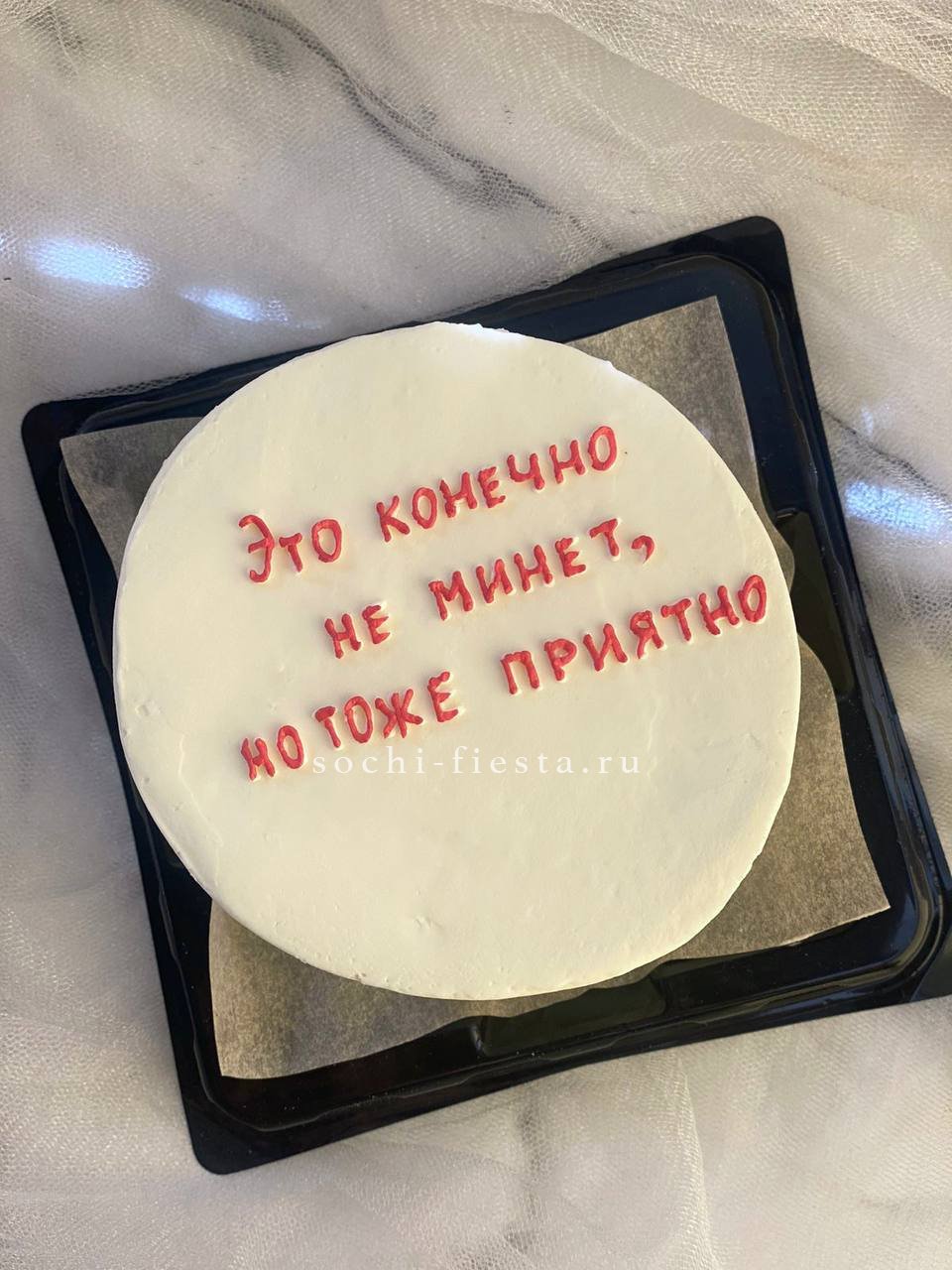 Миниатюрный торт с яркой надписью и домашним теплом в каждом слое. Крем держит форму, а бисквит остается влажным благодаря небольшому объему и свежести выпечки.