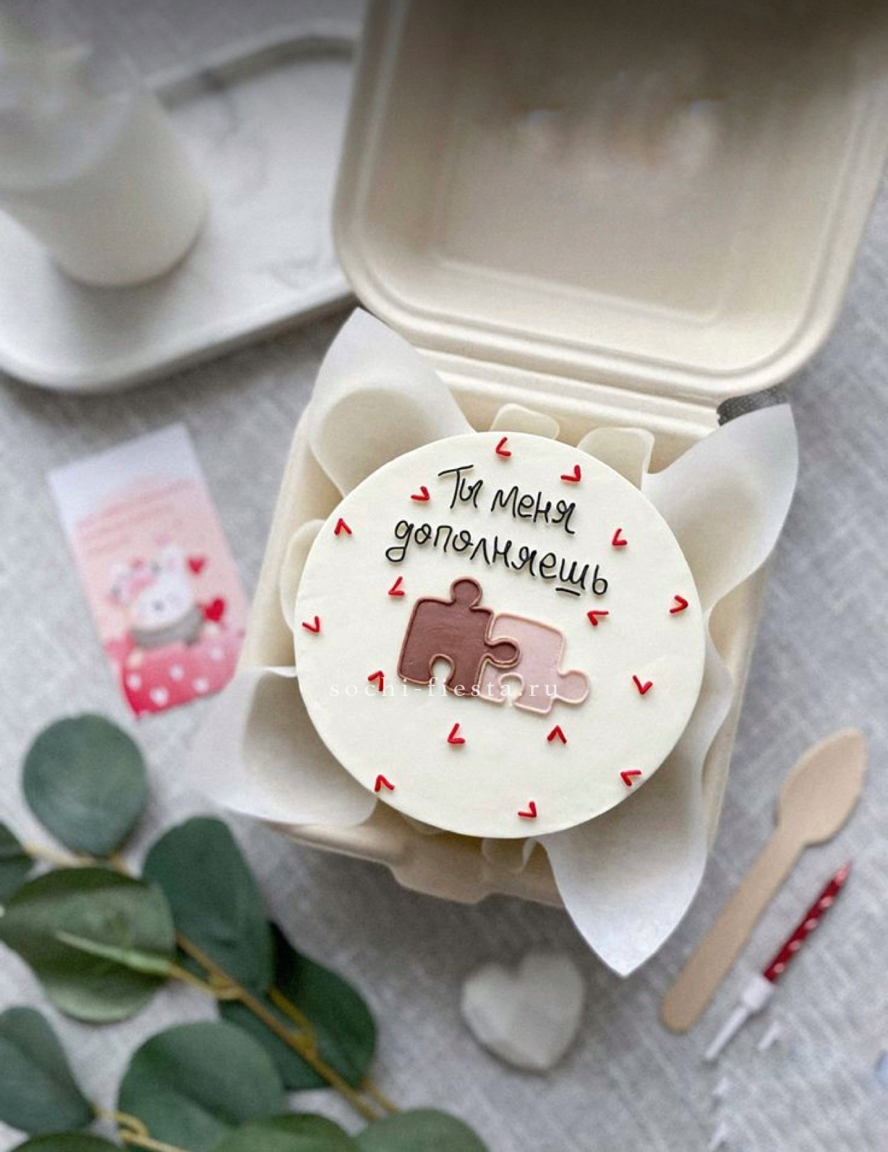 Три слова на поверхности торта говорят без лишних объяснений. Крем и декор создают завершенную картинку в формате персональной порции. Начинка на выбор делает момент еще приятнее.